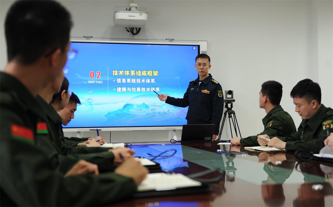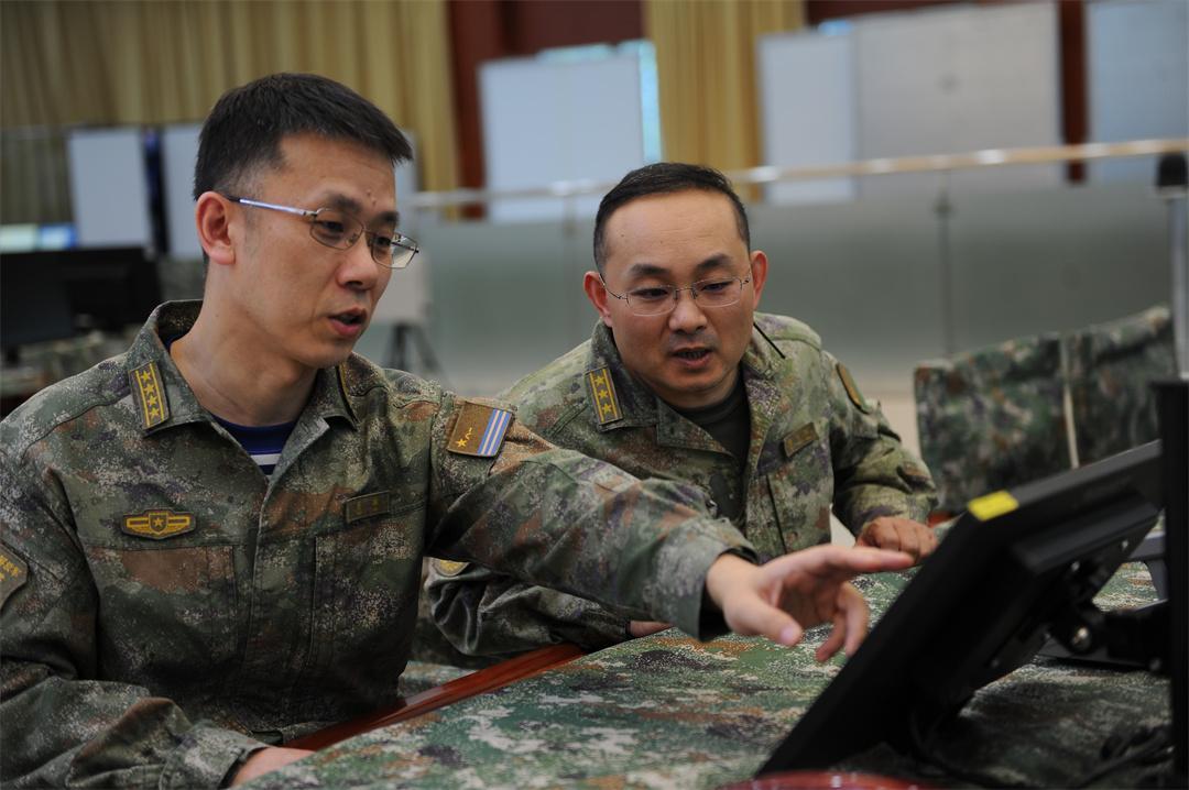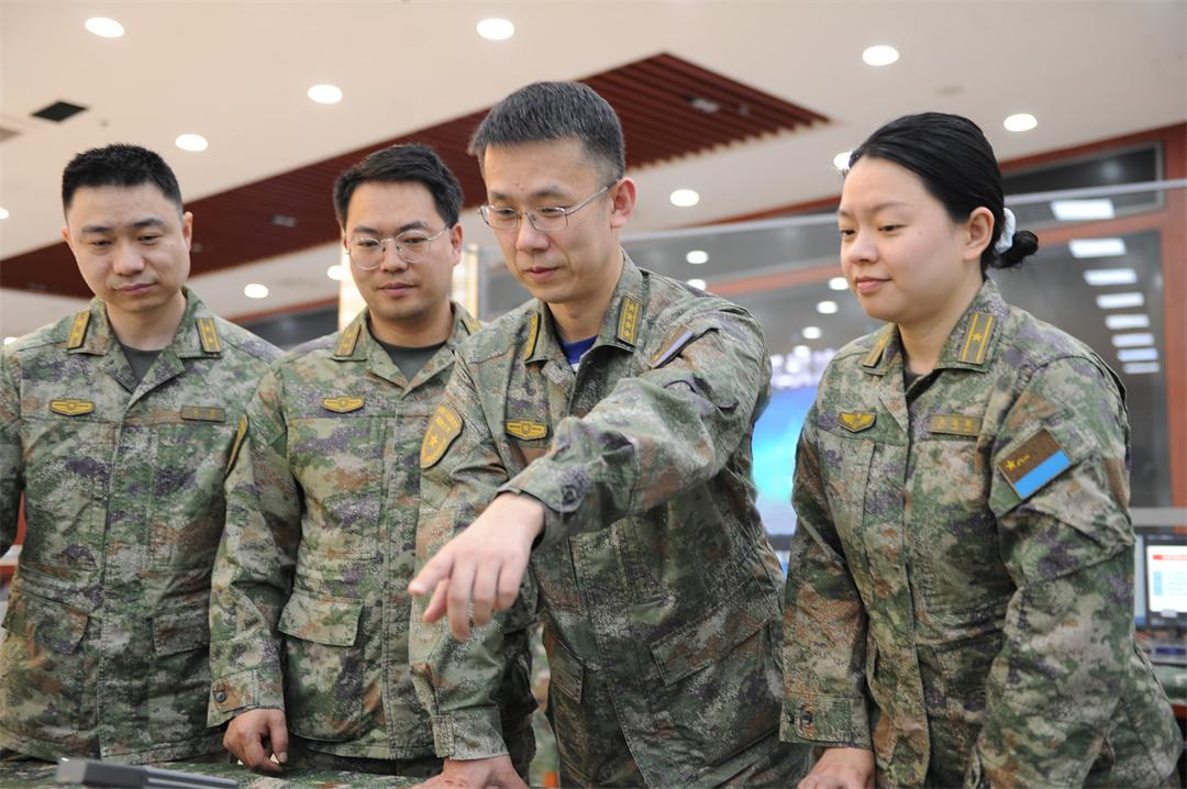 圖為吳琳(右二)和團(tuán)隊(duì)成員分析評(píng)估戰(zhàn)場(chǎng)態(tài)勢(shì)。