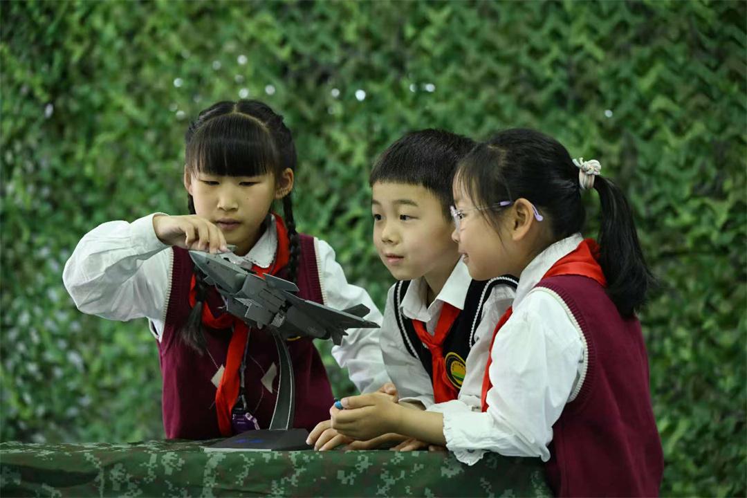 圖為孩子們?cè)谟^看裝備模型。