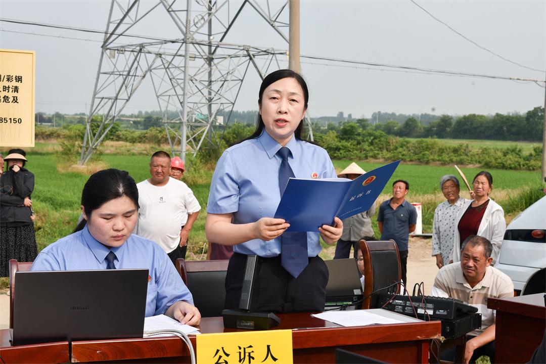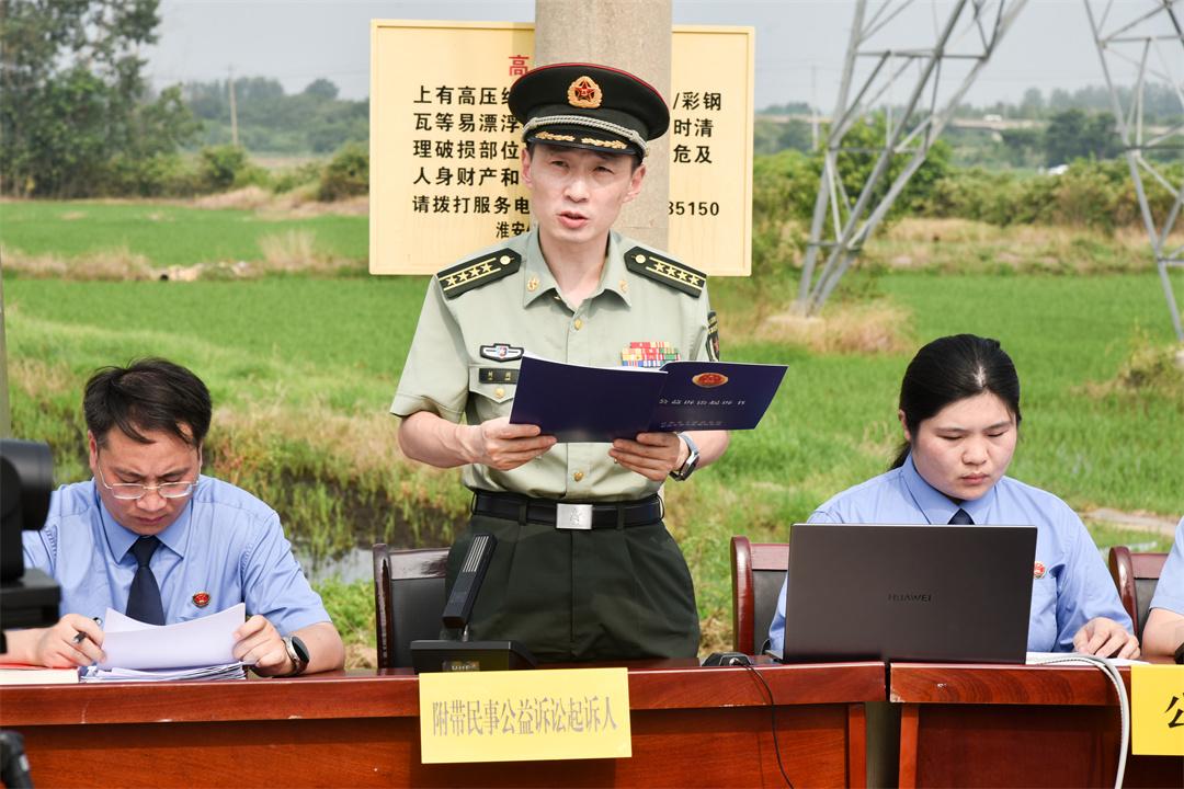 7月15日,解放軍南京軍事檢察院協(xié)同淮安市盱眙縣人民檢察院,對一起過失損壞軍事通信案提起刑事附帶民事公益訴訟,并在案發(fā)地盱眙縣馬壩鎮(zhèn)一處農(nóng)田間公開開庭審理。盱眙縣人民檢察院檢察長潘凌云作為公訴人出庭指控犯罪,南京軍事檢察院大校檢察長劉劍作為附帶民事公益訴訟起訴人出庭提起民事公益訴訟,盱眙縣人民法院院長田庚擔(dān)任審判長。為加大案件警示教育效果,庭審邀請全國人大代表、江蘇省人大代表、部隊有關(guān)人員,以及案發(fā)地附近村民100余人參與旁聽。