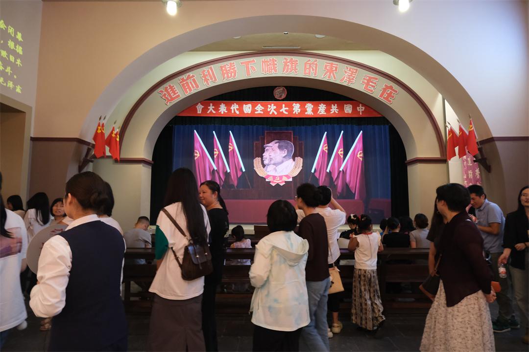 中國共產(chǎn)黨第七次全國代表大會(huì)會(huì)場在展廳復(fù)原——紅色條幅上寫著“在毛澤東的旗幟下勝利前進(jìn)”,投票箱、陜甘寧邊區(qū)政府黨團(tuán)委員會(huì)獻(xiàn)給中共七大的賀幛等也同時(shí)展出,毛澤東的代表證也出現(xiàn)在“會(huì)場”。紅色封皮內(nèi)左頁上方,兩行橫印“中國共產(chǎn)黨第七次全國代表大會(huì)”,下方豎印“代表證”,旁邊是手寫的序列號(hào);右頁上方橫印座號(hào)、姓名和注意事項(xiàng)。當(dāng)時(shí),毛澤東坐在1排7號(hào)。