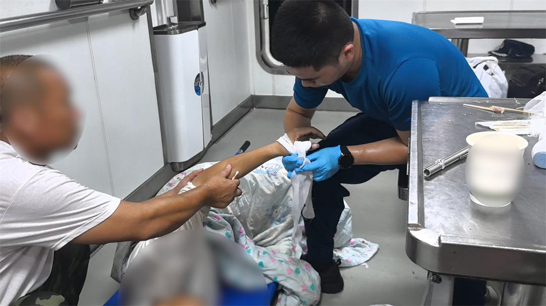 8日凌晨2時許,永隆艦抵達(dá)救助漁船,先將受傷漁民抬至擔(dān)架并進(jìn)行基本固定,隨后成功將受傷漁民轉(zhuǎn)移至艦上,對其受傷部位進(jìn)行消毒和包扎。返航期間,醫(yī)師密切觀察傷者生命體征,同時不斷安撫傷者情緒。經(jīng)過一夜的緊急航行,永隆艦于8日6時許順利靠泊南通海警碼頭,成功將受傷漁民轉(zhuǎn)移至岸上接應(yīng)的救護(hù)車并送往南通市海門區(qū)人民醫(yī)院救治。目前,受傷漁民生命體征平穩(wěn),正在接受進(jìn)一步治療。