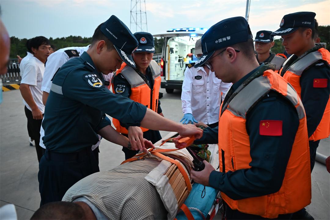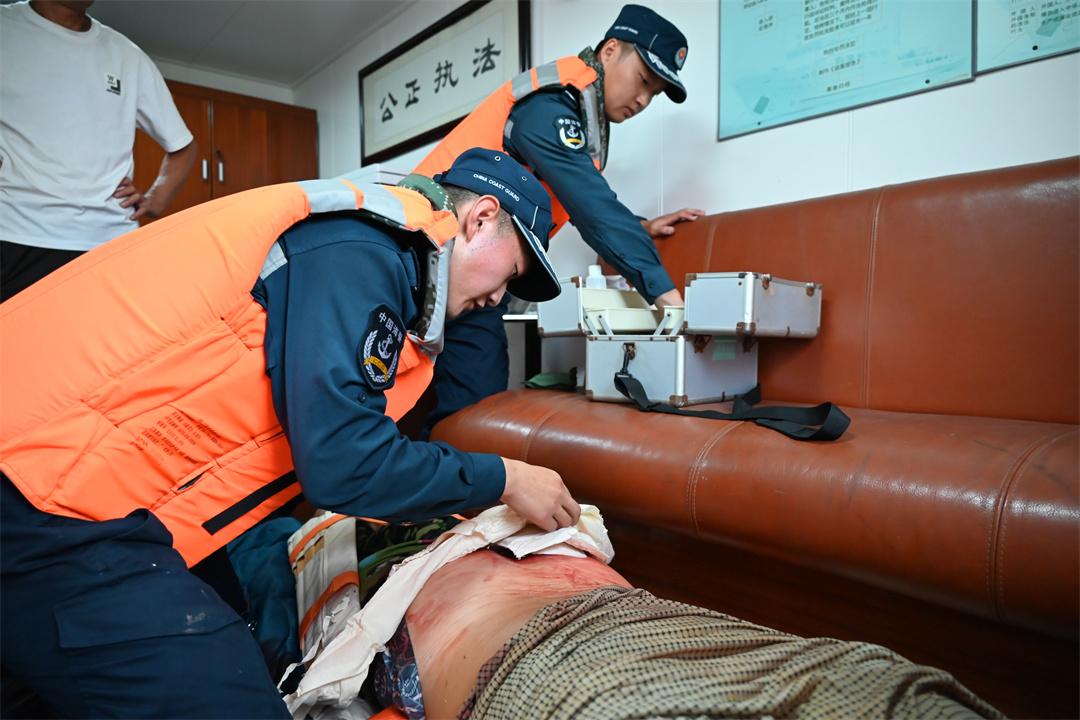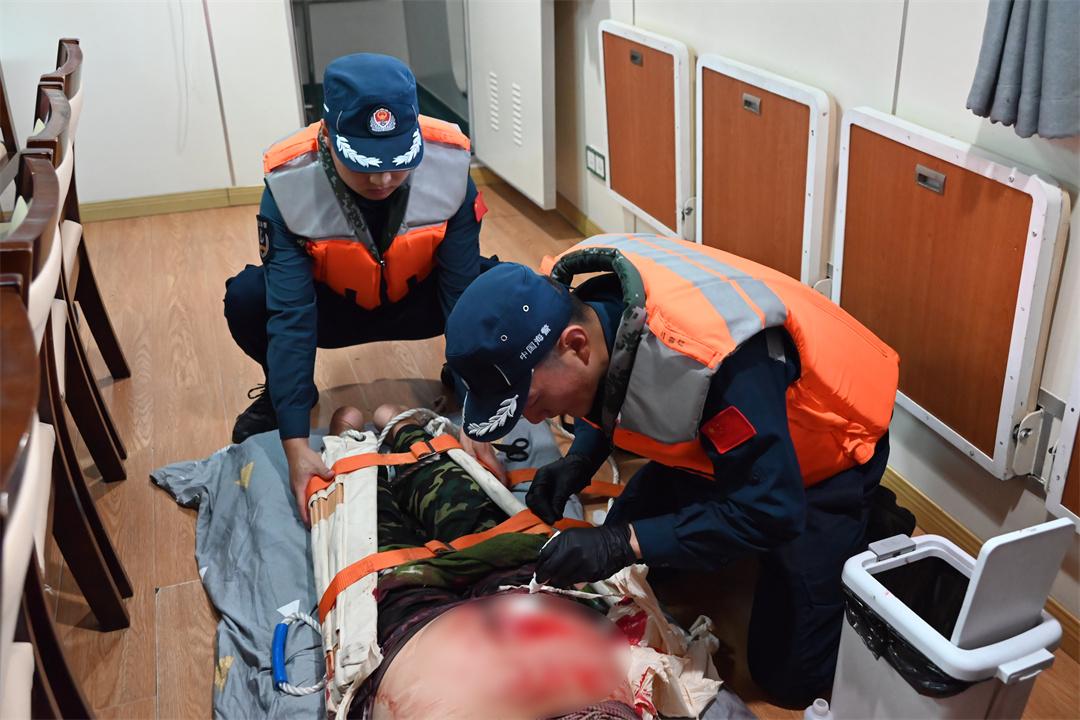 海警執(zhí)法員看準(zhǔn)時(shí)機(jī)在兩船并靠瞬間果斷跳幫,登船緊急開展消毒止血、包扎固定等處理后,與漁政工作人員合力將傷員轉(zhuǎn)運(yùn)至海警執(zhí)法艇。隨艇醫(yī)護(hù)人員持續(xù)觀察救治,安撫傷員情緒,與此同時(shí),崇明海警局聯(lián)系駐地醫(yī)院安排救護(hù)車趕赴碼頭轉(zhuǎn)接傷員。