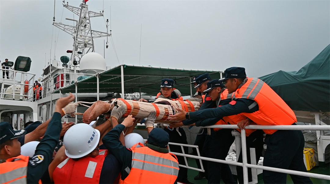 接警后,崇明海警局迅速準(zhǔn)備醫(yī)療器材,海警執(zhí)法艇高速航行30海里后與載有傷員的漁政執(zhí)法船成功匯合,接力救援迅速展開。此時(shí)暴雨將至,海況惡劣,涌高浪急,兩船船舷并靠期間上下起伏,且傷員受傷部位出血嚴(yán)重,動(dòng)彈不得,給實(shí)施救援造成了不小阻礙。