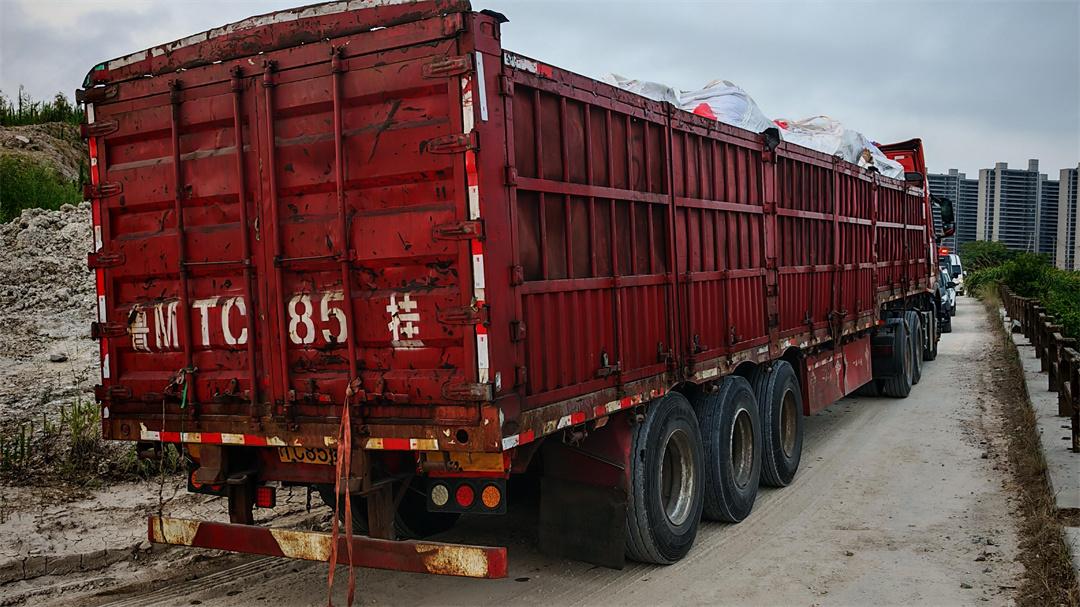 執(zhí)法艇到達現(xiàn)場時,發(fā)現(xiàn)1艘未編刷船名船號的船舶正在碼頭卸貨,海警執(zhí)法員憑借經驗判斷該船正在進行違法活動,果斷進行登臨檢查。經查,該船系“三無”船舶,長約40米,寬約7米,船頭白色,船身藍紅色,船艙內存有大量白色編織袋,袋內有牛肚、牛雜等凍品100余噸,隨船人員無法提供該批凍品合法來源證明,該行為涉嫌構成走私國家禁止進出口貨物、物品罪。同時,另一組海警執(zhí)法員在碼頭查獲6輛準備轉運走私凍品的半掛車,查獲凍品40余噸。目前,案件正在進一步偵辦中。