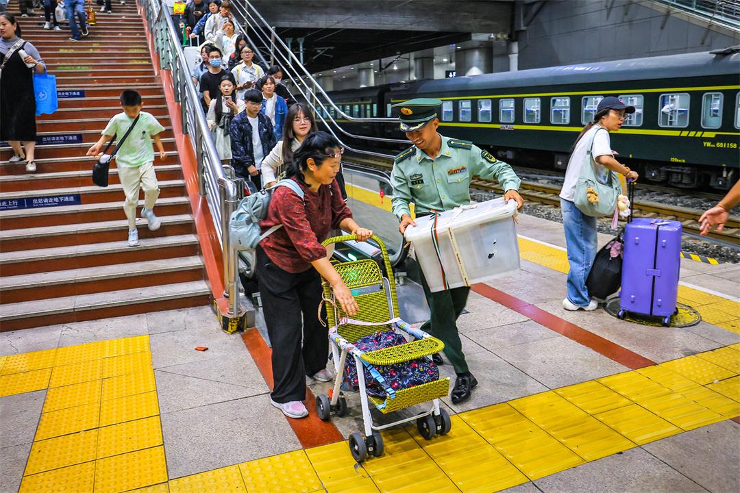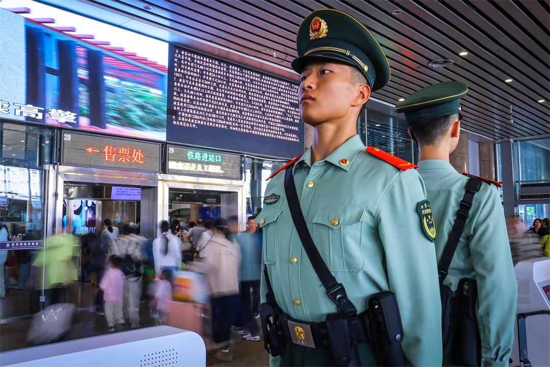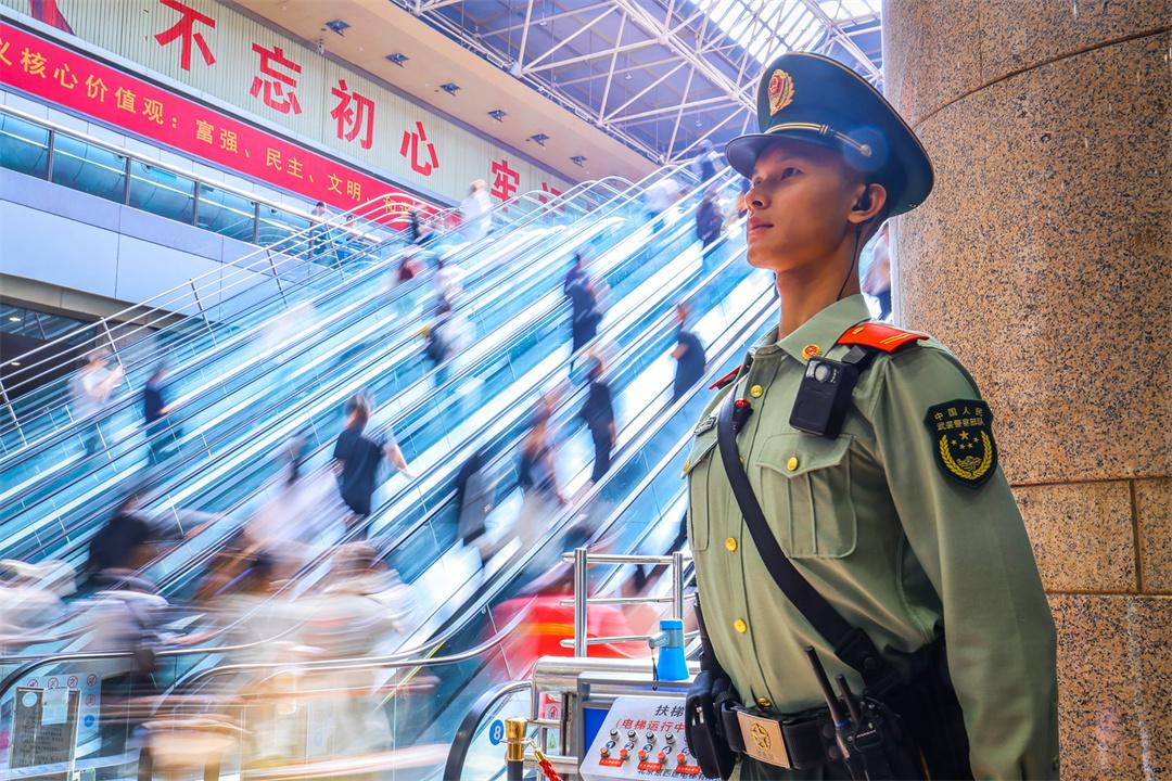國(guó)慶假期最后兩天,北京鐵路交通樞紐迎來雙向返程客流高峰。為保障旅客安全有序出行,武警北京總隊(duì)執(zhí)勤第六支隊(duì)官兵堅(jiān)守執(zhí)勤戰(zhàn)位,與重點(diǎn)站區(qū)管委會(huì)、鐵路公安等部門搭建聯(lián)防聯(lián)控體系,通過實(shí)時(shí)客流監(jiān)測(cè)系統(tǒng)動(dòng)態(tài)調(diào)整勤務(wù)部署,在進(jìn)出站口、安檢區(qū)、候車大廳等關(guān)鍵點(diǎn)位設(shè)置警戒哨,協(xié)助維護(hù)秩序,熱心提供幫助,以實(shí)際行動(dòng)確保旅客平安順利出行。