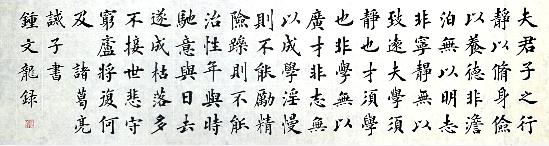 如何將家庭教育與書法有機結(jié)合?鐘文龍?zhí)剿鞒隽艘粭l用楷書書寫歷朝傳世家訓(xùn)名篇的道路,他在不斷書寫《顏氏家訓(xùn)》《家范》《誡子書》《朱子家訓(xùn)》等歷朝傳世家訓(xùn)名篇的過程中,逐漸感悟到通過楷書來書寫家訓(xùn),并在家中進行懸掛,可以起到潤物無聲潛移默化的激勵匡正等教育作用。