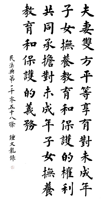 2020年7月11日,司法部普法與依法治理局和法制日報社共同主辦了“書·法”系列活動。鐘文龍先生應(yīng)邀書寫民法典第一千零五十八條: “夫妻雙方平等享有對未成年子女撫養(yǎng)、教育和保護的權(quán)利,共同承擔對未成年子女撫養(yǎng)、教育和保護的義務(wù)?!币蚱渥髌分苷胖露H受好評。