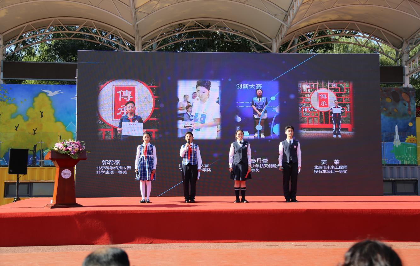 活動現(xiàn)場,分別獲得2021年第三屆北京科學傳播大賽中榮獲科學表演團體一等獎、2023年北京市未來工程師競賽小學組一等獎、2022年世界機器人大賽總決賽挑戰(zhàn)賽一等獎、2023全國青少年航天創(chuàng)新大賽二等獎的四名學生代表郭希泰、劉嘉樂、秦丹蕾、姜萊,分享了參加科技活動的經(jīng)歷與心得體會?!懊恐軆晒?jié)的科學課點燃了我們的太空夢”“在一次次賽前集訓中,通過老師帶領我們查找資料、研究原理、設計作品等動手實踐活動,我提高了綜合運用知識的能力和創(chuàng)造性解決問題的能力”“曾經(jīng)基礎科學知識薄弱的我,各種提問占用老師很多時間,老師卻總是表揚我虛心求教的態(tài)度”“在討論比賽項目時,我們在相互提問中碰撞思維的火花,我學會了如何傾聽、如何溝通”……學生們認為,他們科學興趣的激發(fā)、科學探究能力的提升、科技實踐能力的強化、科技探索之路的開啟,離不開學校豐富的科技教育課程、科技競賽平臺的搭建、老師的悉心教導與鼓勵、小組的合作探究。