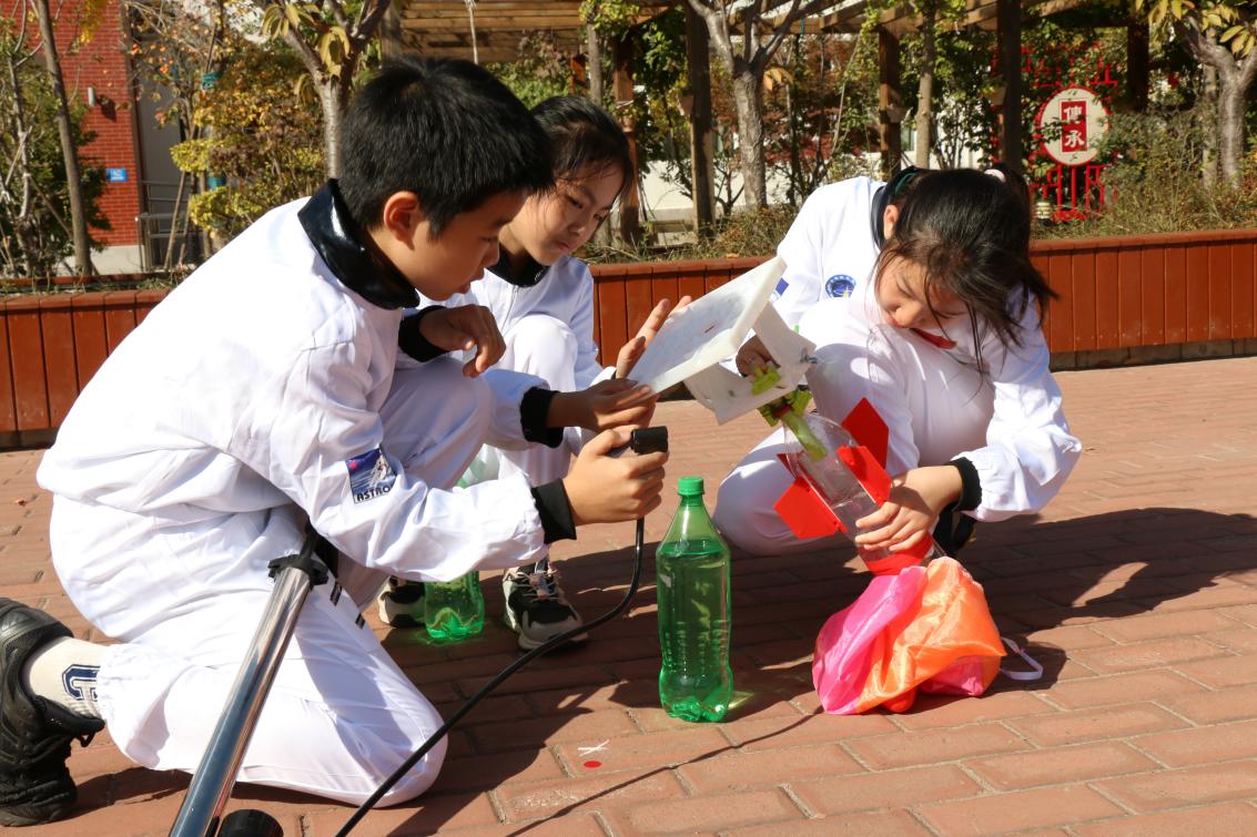 10月27日,一艘艘“水火箭”在北京市朝陽區(qū)將府實驗學校(以下簡稱將府學校)操場北側凌空飛起,孩子們的航天夢、科技夢也隨之起飛……