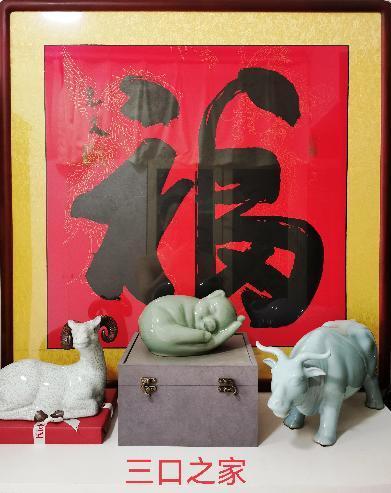 毫無(wú)疑問(wèn),正是這件作品隱含的濃烈親情元素和快樂(lè)因子,深深吸引并打動(dòng)了我,才最終成全了這筆交易,甚至讓我一不做二不休,干脆還買下了自己和夫人的生肖作品——羊和牛。返京后,我們將這三件清一色吃素的屬相工藝品,和家中原有的一幅大紅“?!弊?jǐn)[在一起,便組合出一幅別有情趣的“和諧家園風(fēng)景圖”:幸福一家人、快樂(lè)一家親。