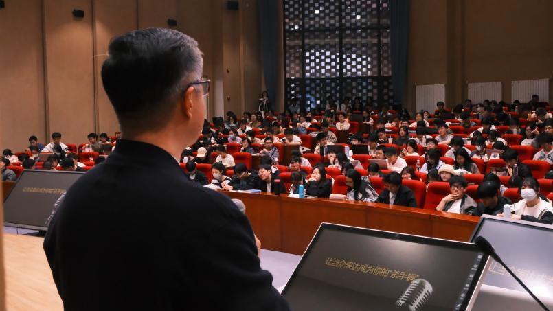 4月10日,一場(chǎng)關(guān)于語言藝術(shù)的精彩講座在北京化工大學(xué)昌平校區(qū)開講。國培源老師以《談青年人語言藝術(shù)之美》為題,為現(xiàn)場(chǎng)師生帶來了一場(chǎng)充滿智慧與幽默的表達(dá)盛宴。從“社恐”到“社?!?,從“不敢開口”到“侃侃而談”,北京廣播電視臺(tái)主持人、評(píng)論員、主任播音員國培源老師用幾個(gè)實(shí)用技巧,揭示了當(dāng)眾表達(dá)的核心奧秘——“語言是最厲害的武器”。