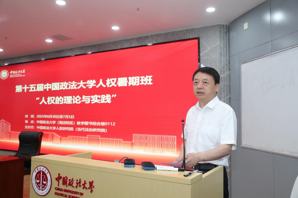 中國政法大學(xué)校長馬懷德出席開班儀式并致辭。馬懷德提出,中國政法大學(xué)始終致力于推動中國特色法學(xué)學(xué)科體系、學(xué)術(shù)體系、話語體系建設(shè),構(gòu)建中國法學(xué)自主知識體系。作為“國家人權(quán)教育與培訓(xùn)基地”和“國家高端智庫建設(shè)培育單位”,人權(quán)研究院(當(dāng)代法治研究院)不斷提升政治站位,深入貫徹落實國家人權(quán)行動計劃,堅定履行人權(quán)教育培訓(xùn)、理論研究、對外交流三大使命。他強調(diào),人權(quán)是全人類共同的價值追求,人權(quán)教育不僅是知識的傳授,更是價值的塑造與人格的涵養(yǎng)。人權(quán)暑期班作為一項高水平、跨領(lǐng)域、國際化的人權(quán)教育實踐,不僅是人權(quán)知識的傳播課堂,更是理念交匯的對話平臺,青年學(xué)子應(yīng)以跨學(xué)科視角,多維度、多視角、多層次了解人權(quán)研究的重大議題,在多邊、多元的交流中不斷拓展全球視野與認知邊界,努力成為具有全球視野和中國立場的法治人才。他同時希望各位學(xué)員能夠借此機會深入開展學(xué)術(shù)交流,共同推動中國人權(quán)學(xué)科建設(shè)、學(xué)術(shù)研究與國際傳播。