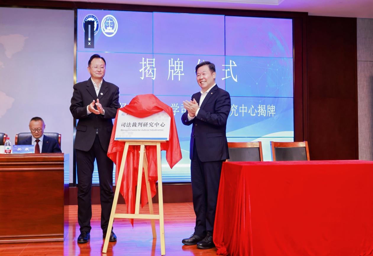 對(duì)外經(jīng)濟(jì)貿(mào)易大學(xué)黨委書記黃寶印,最高人民檢察院咨詢委員會(huì)副主任徐顯明共同為司法裁判研究中心揭牌。主辦方供圖