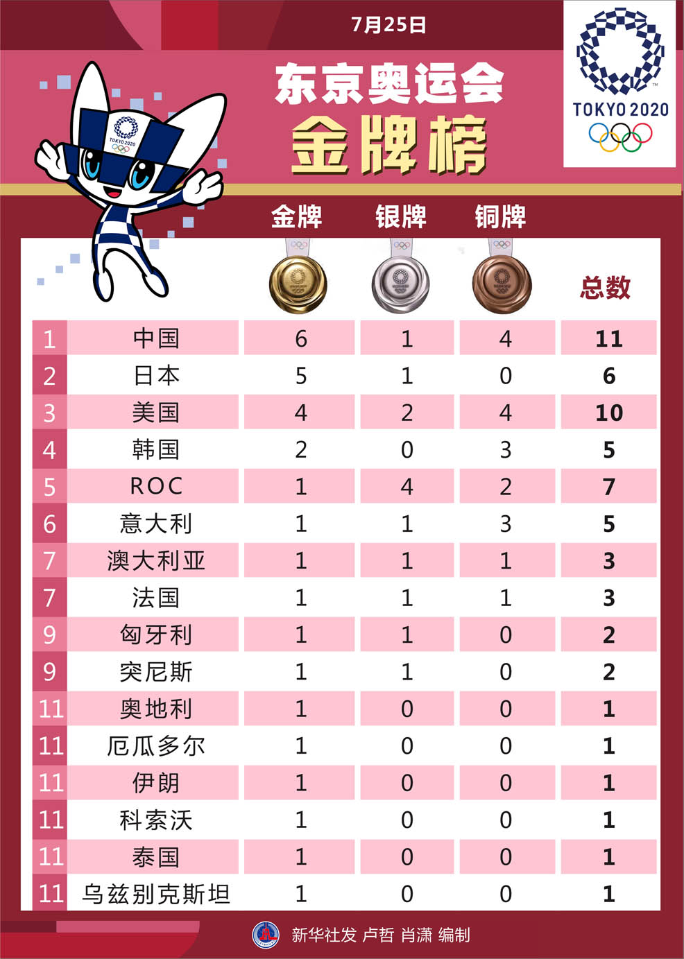 圖表:7月25日東京奧運(yùn)會(huì)金牌榜