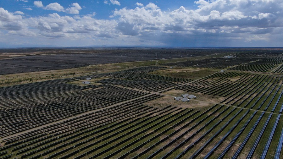 近年來,青海省海南藏族自治州依托土地資源和太陽能資源優(yōu)勢,著力推進新能源發(fā)電項目落地。截至目前,在位于共和縣的海南州綠色產業(yè)發(fā)展園區(qū),光伏、風電、光熱新能源裝機容量超過2000萬千瓦。按測算,通過新能源發(fā)電這里每年可節(jié)約標準煤736.96萬噸,減排二氧化碳2237.2萬噸。