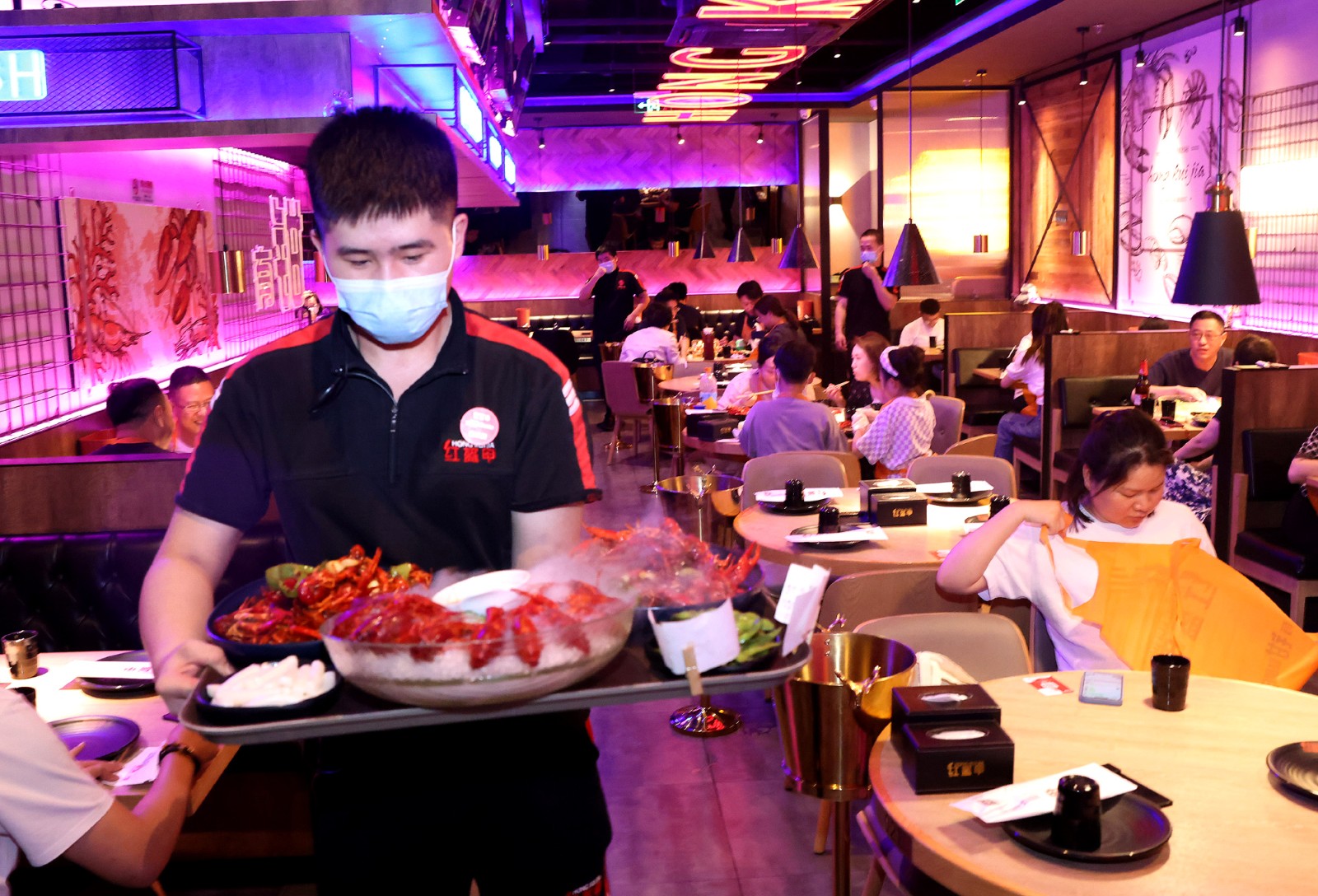 6月29日,上海市定西路一家餐廳的工作人員在為顧客上菜。