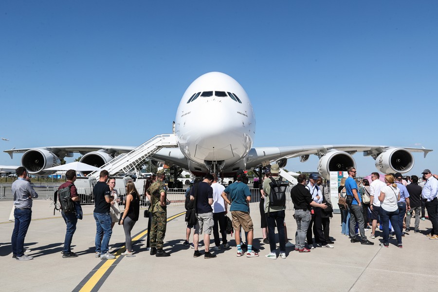6月22日,在德國(guó)首都柏林南郊,人們排隊(duì)準(zhǔn)備參觀阿聯(lián)酋航空公司空中客車(chē)A380-800客機(jī)。
