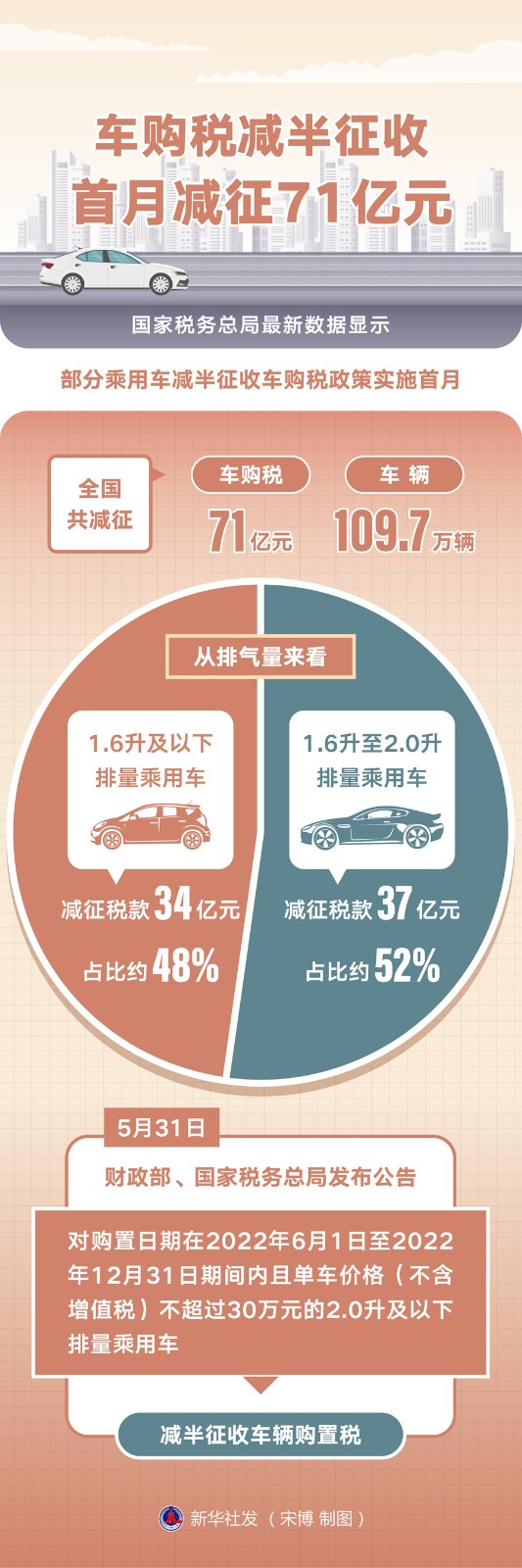 自6月1日起實施的部分乘用車減半征收車購稅政策已經(jīng)“滿月”。國家稅務(wù)總局最新數(shù)據(jù)顯示,政策實施首月,全國共減征車購稅71億元,減征車輛109.7萬輛。從排氣量來看,1.6升及以下排量乘用車減征稅款34億元,占比約48%;1.6升至2.0升排量乘用車減征稅款37億元,占比約52%。