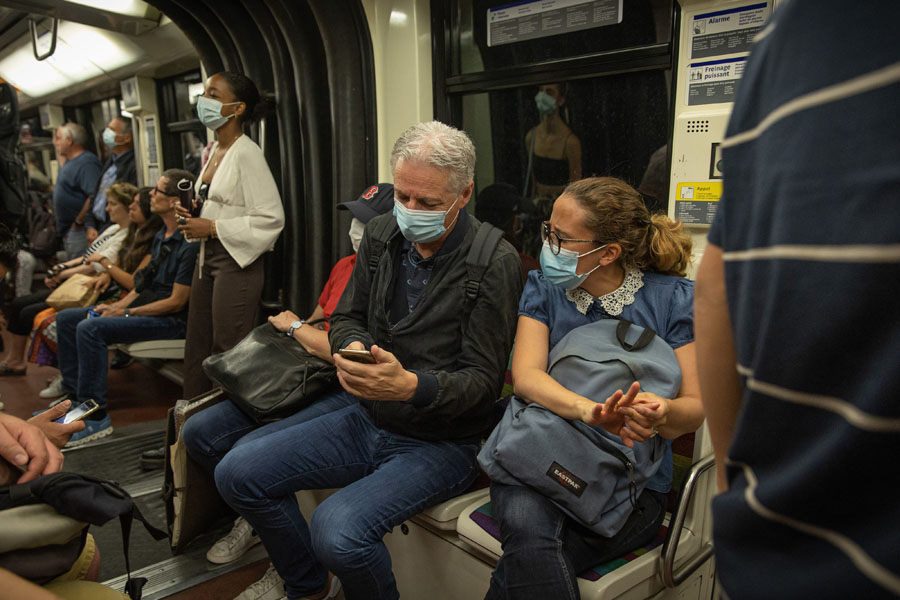 7月8日,人們佩戴口罩在法國巴黎乘坐地鐵。