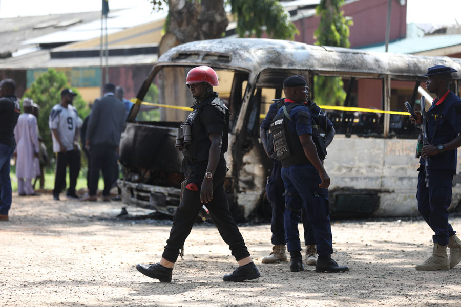 7月6日,在尼日利亞首都阿布賈,幾名警察在監(jiān)獄遇襲現(xiàn)場(chǎng)警戒。