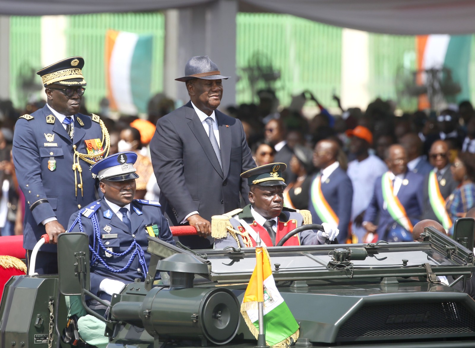8月7日,在科特迪瓦亞穆蘇克羅,總統瓦塔拉(左三)出席獨立日閱兵儀式。
