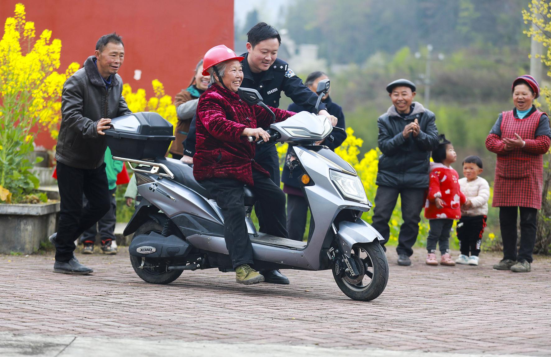 3月26日,貴州省黔西市公安局金蘭派出所民警在清華村院壩里,指導(dǎo)村民練習(xí)騎車技術(shù),講解道路交通安全知識(shí)。