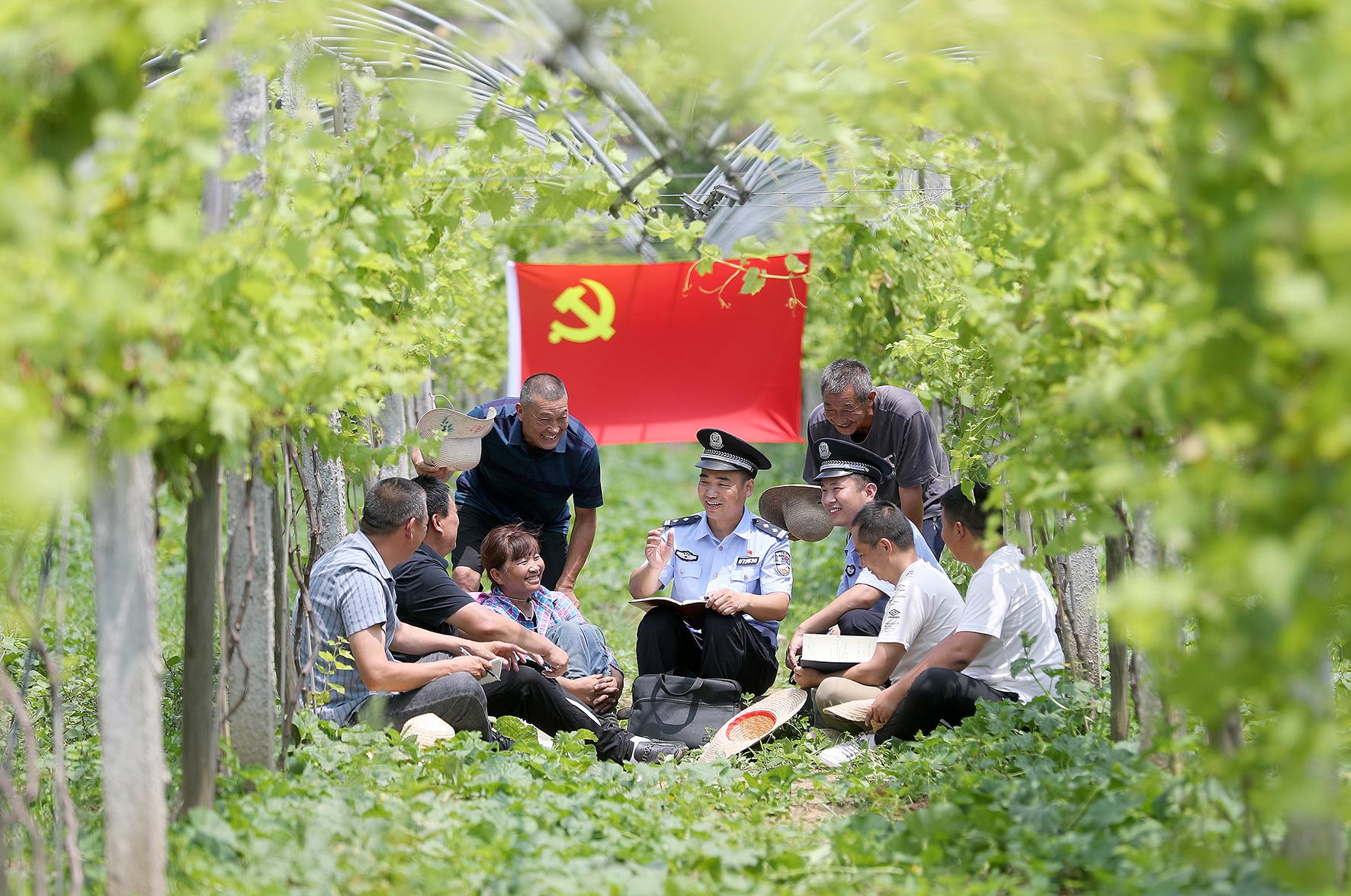 6月27日,在湖北省鐘祥市磷礦鎮(zhèn)聯(lián)合村葡萄園里,一場(chǎng)形式新穎、泥土味兒十足的“主題黨日”活動(dòng)正在進(jìn)行。在主題教育活動(dòng)中,鐘祥市公安局堅(jiān)持“黨務(wù)引領(lǐng)警務(wù)”,在民營(yíng)企業(yè)、專業(yè)合作社、公益性組織、批發(fā)零售行業(yè)、社會(huì)服務(wù)行業(yè)建立黨支部,黨員民警兼任第一書記,通過黨組織活動(dòng),創(chuàng)建“支部搭臺(tái)、民警挑梁、黨員唱戲、群眾參與”的社會(huì)治安綜合治理新模式。