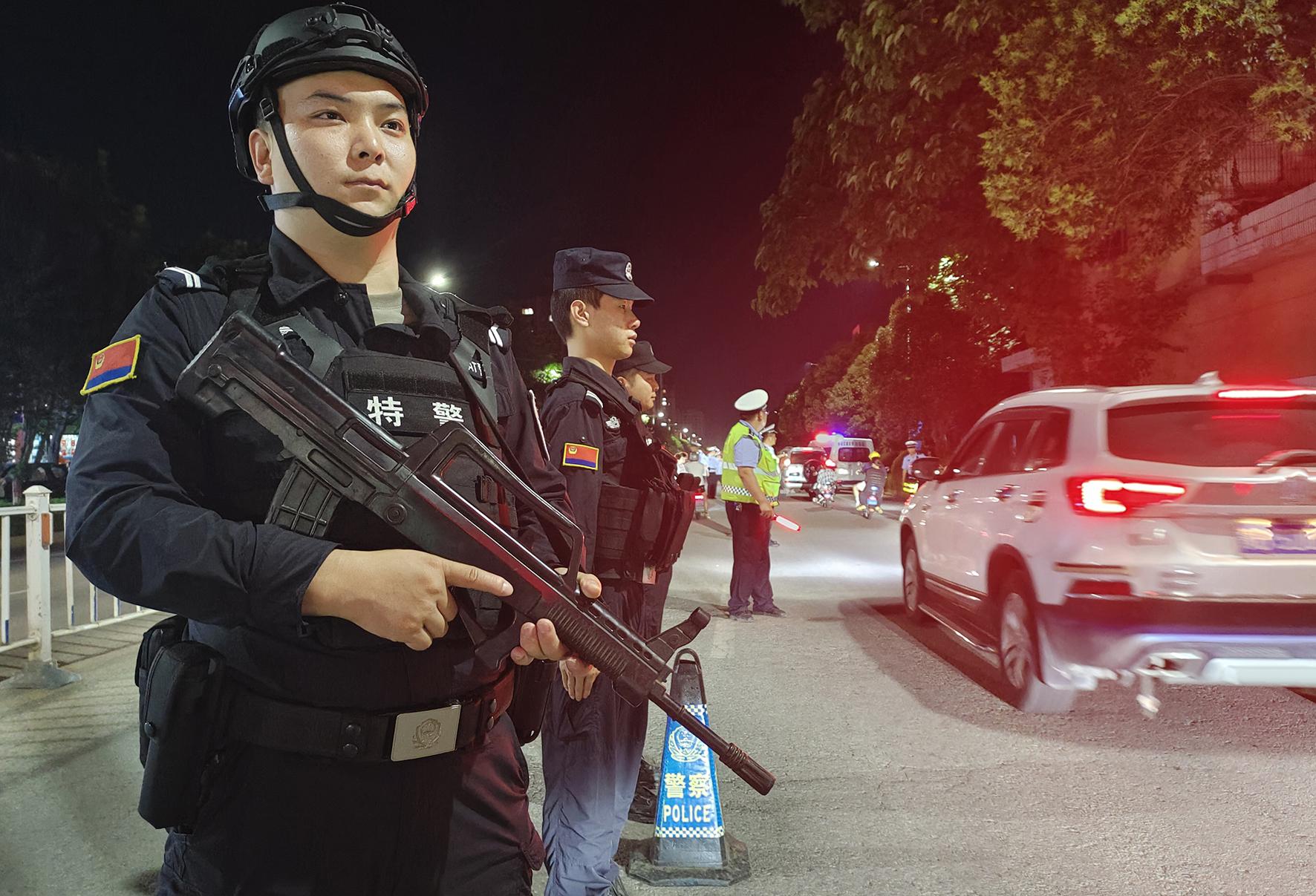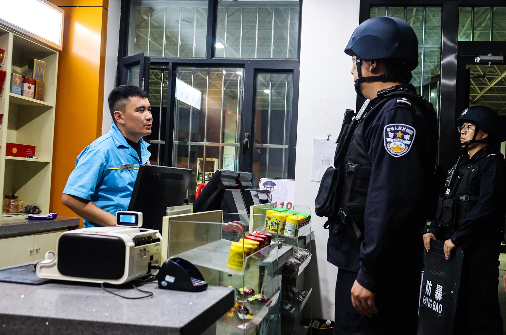 7月9日夜,安徽省舒城縣公安局城中派出所組織警力在縣城區(qū)人員密集場(chǎng)所加強(qiáng)巡邏守護(hù)。