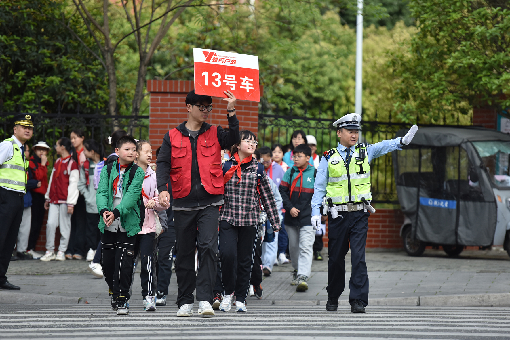 近期,四川省綿陽(yáng)市多所小學(xué)組織學(xué)生開展春季研學(xué)活動(dòng),為保證師生出行安全和減少對(duì)交通的影響,綿陽(yáng)市交警支隊(duì)直屬二大隊(duì)增派警力在學(xué)校門口指揮接送師生的車輛有序停放,護(hù)送師生安全過(guò)馬路。