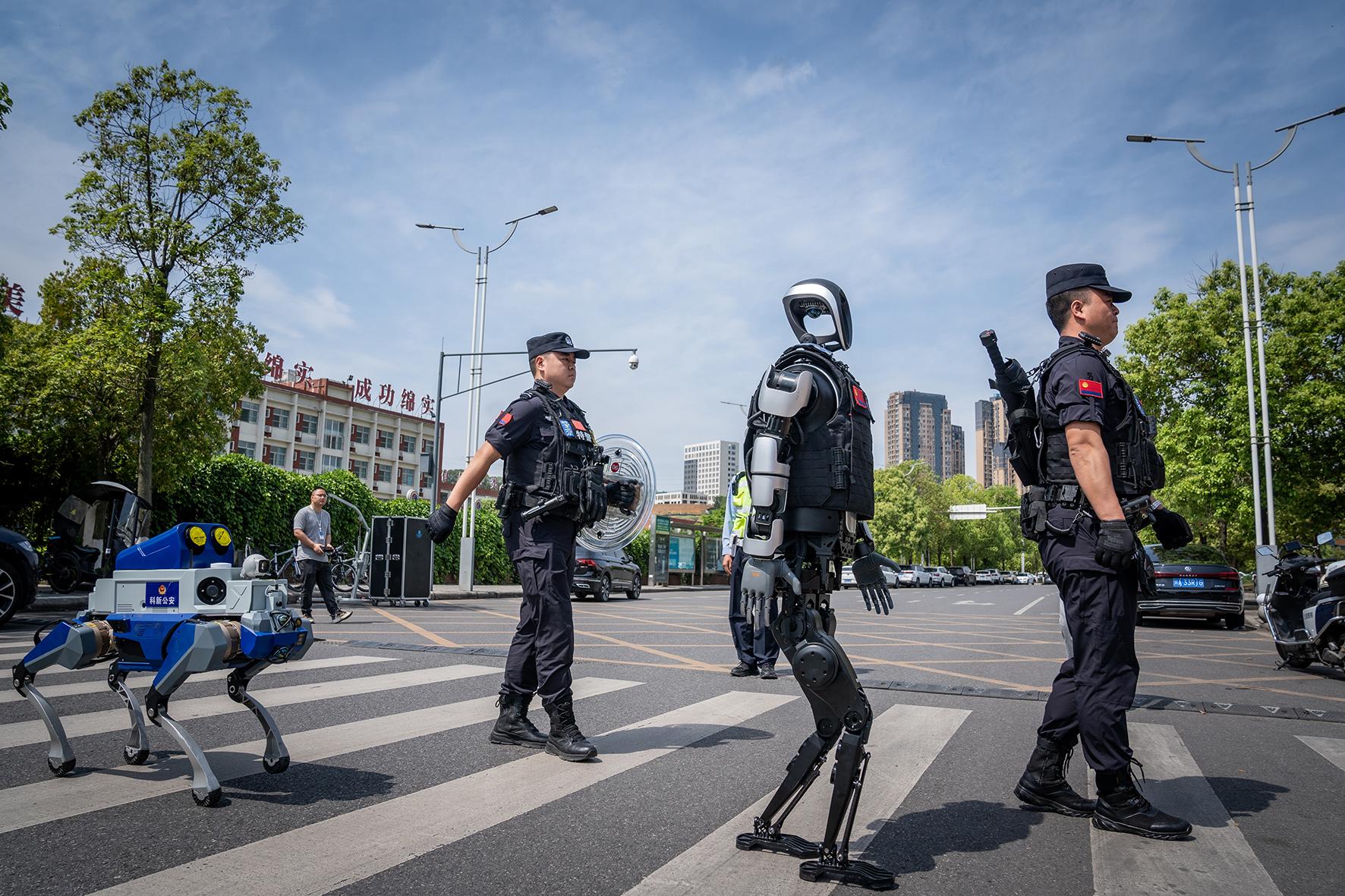 4月27日,“綿陽造”人形巡邏機器人及機器狗,在四川省綿陽市涪城區(qū)教育南路配合綿陽市公安局科技城新區(qū)分局民警開展巡邏防控工作。