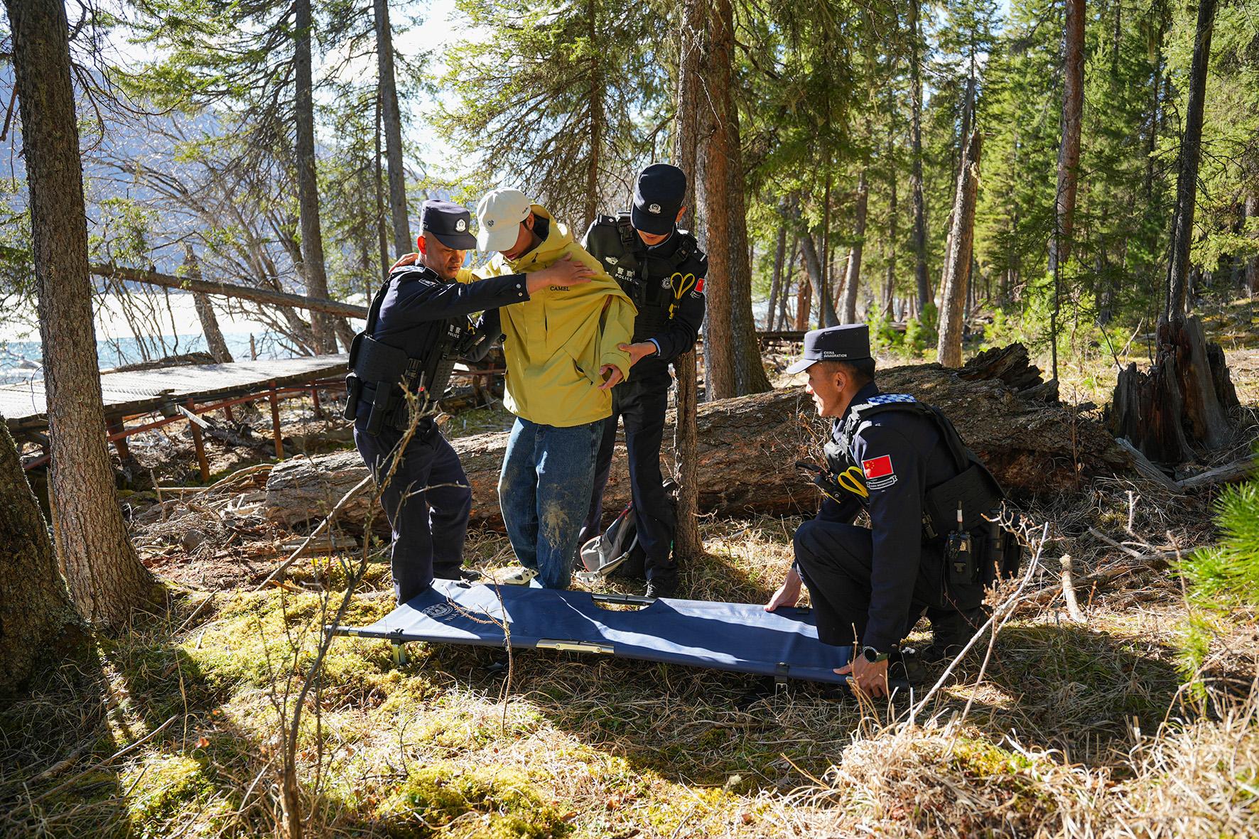 5月2日,新疆阿勒泰邊境管理支隊(duì)喀納斯邊境派出所民警在喀納斯吐魯克巖畫附近救援摔傷游客。