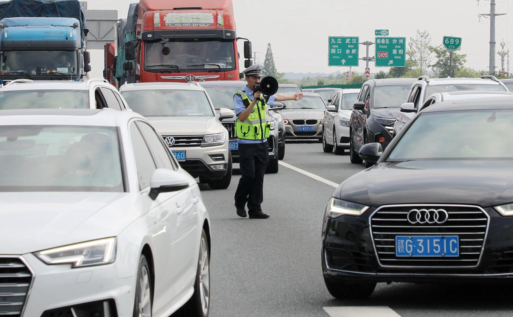 5月1日,江西省公安廳交通管理總隊(duì)高速交警二支隊(duì)民警在福銀高速昌九段執(zhí)勤疏導(dǎo)交通。