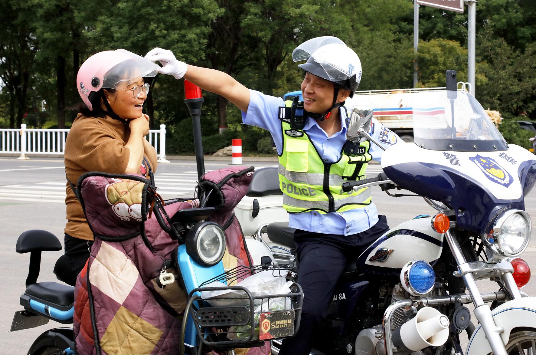 5月5日,陜西省渭南市公安局交警支隊(duì)臨渭大隊(duì)四中隊(duì)民警提醒一輛電動(dòng)車駕駛?cè)舜骱妙^盔。
