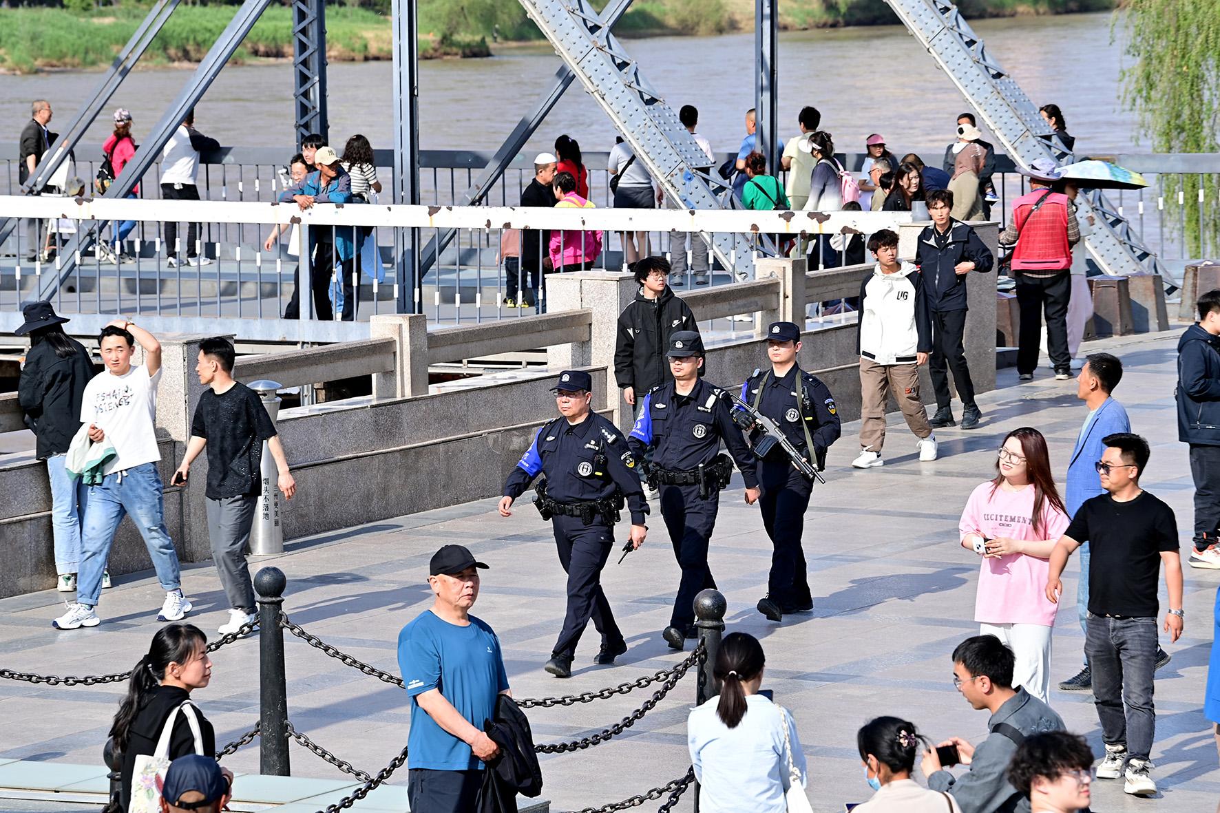5月1日,甘肅省蘭州市公安局城關(guān)分局中山橋警務(wù)站警力在中山橋景點(diǎn)開(kāi)展巡邏。