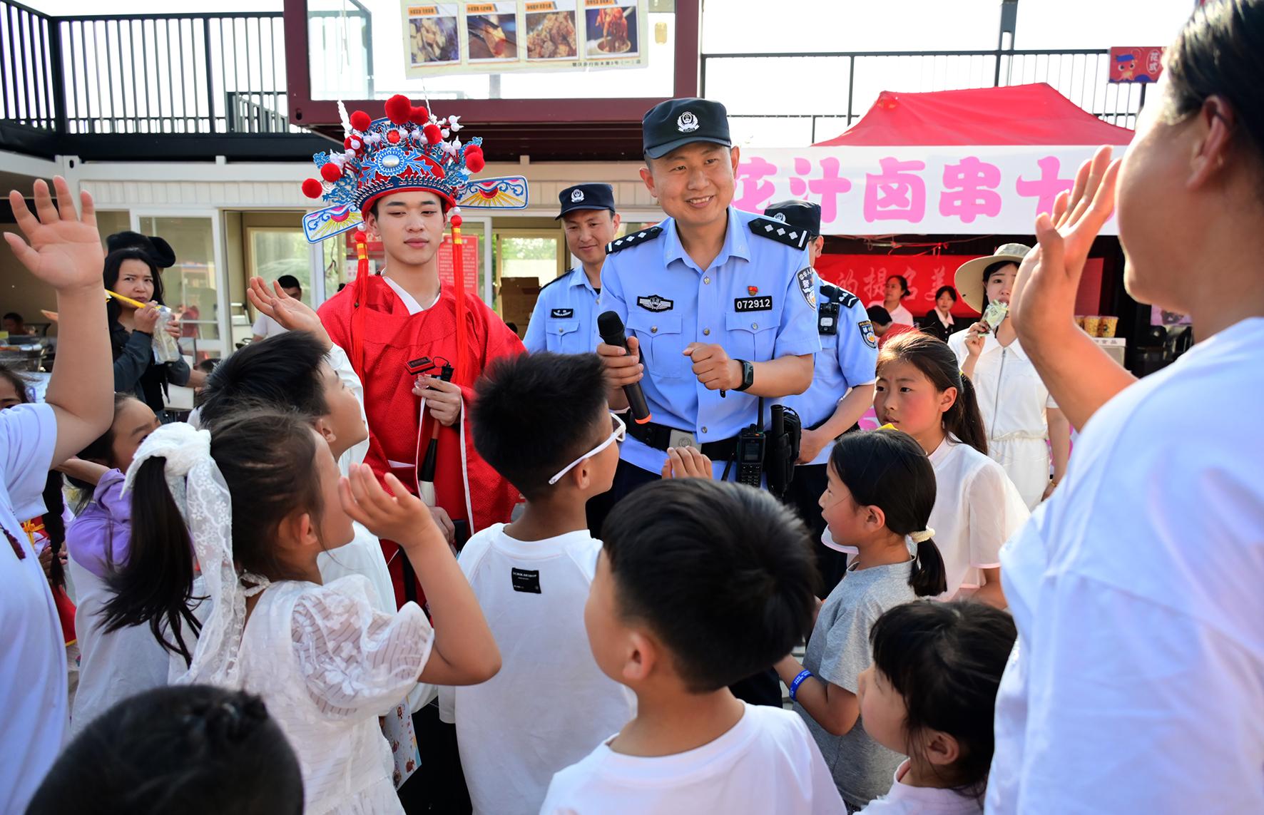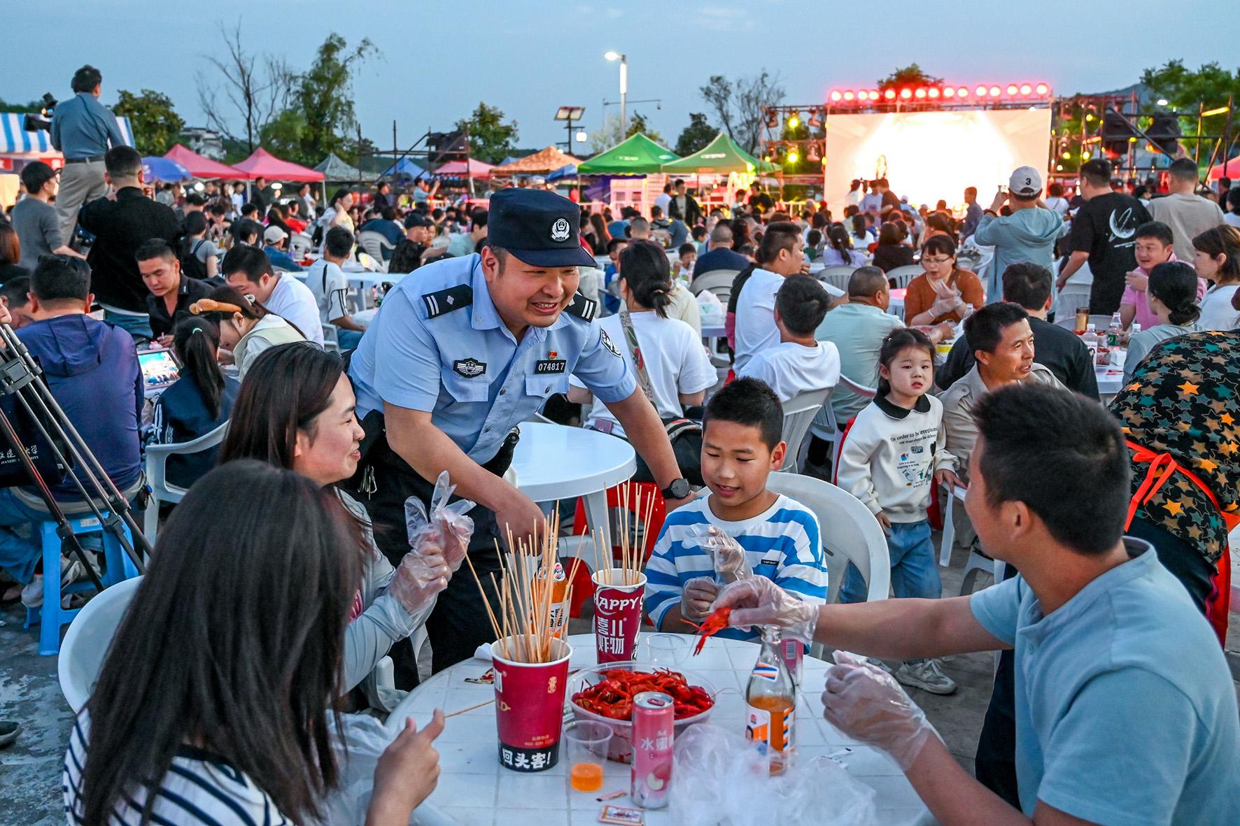 5月4日,安徽省馬鞍山市和縣公安局民警在“龍蝦啤酒音樂(lè)美食季”現(xiàn)場(chǎng)為游客提供安全出行咨詢服務(wù)。