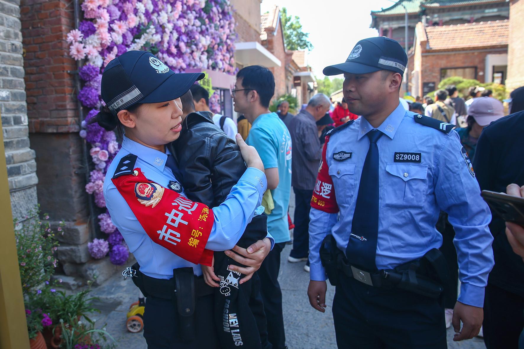5月1日,山東省濟(jì)南市公安局市中區(qū)分局濼源派出所民警幫助一名3歲男孩找到走散的家人。
