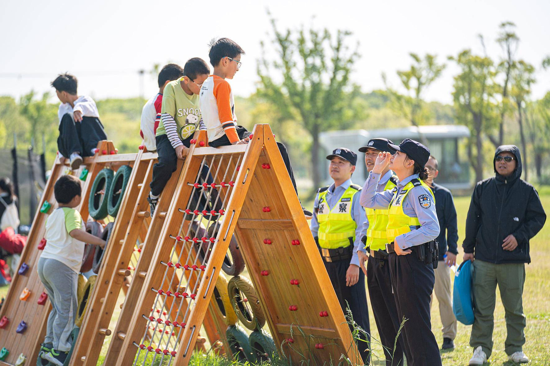 5月2日,上海市公安局崇明分局陳家鎮(zhèn)派出所民警在戶外音樂(lè)嘉年華兒童娛樂(lè)區(qū)域提醒小朋友們注意安全。