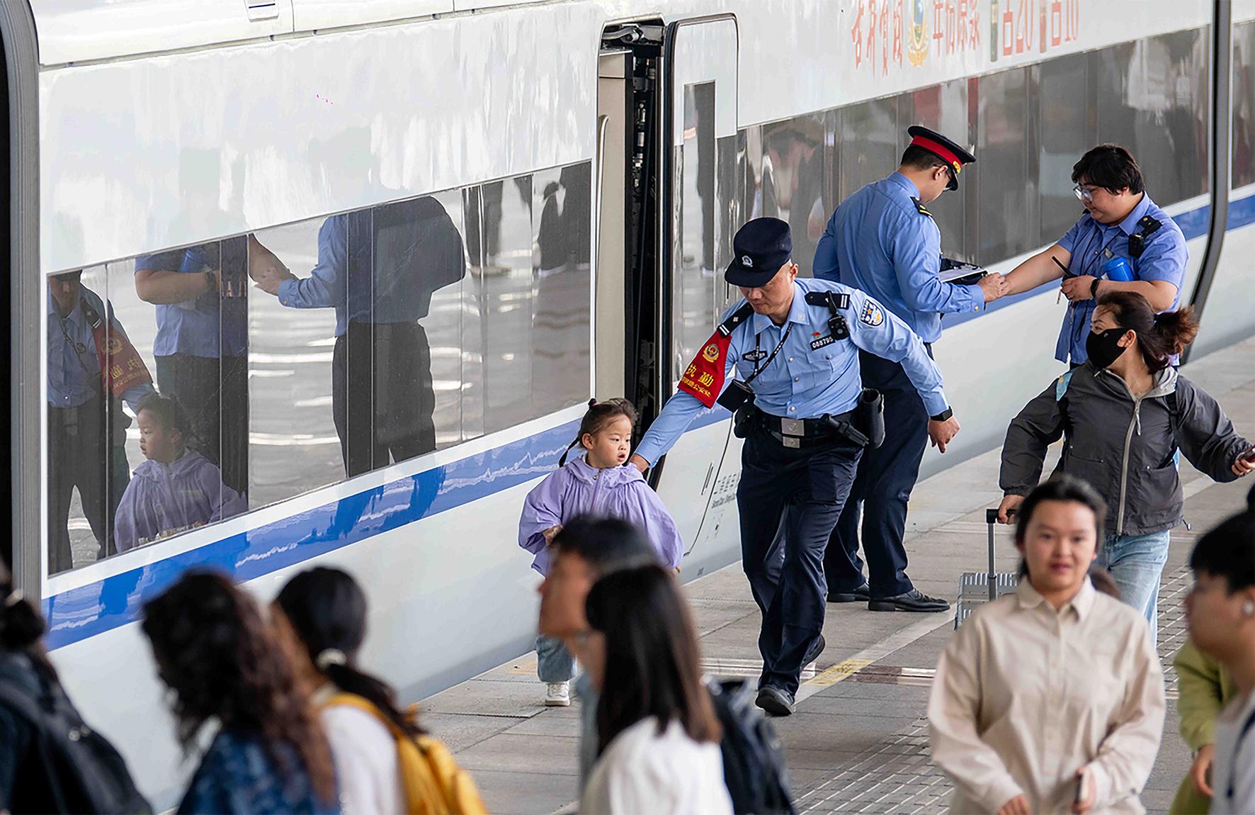 5月1日,南京鐵路公安處泰州站派出所加強(qiáng)警力部署,全力服務(wù)旅客“五一”出行高峰。