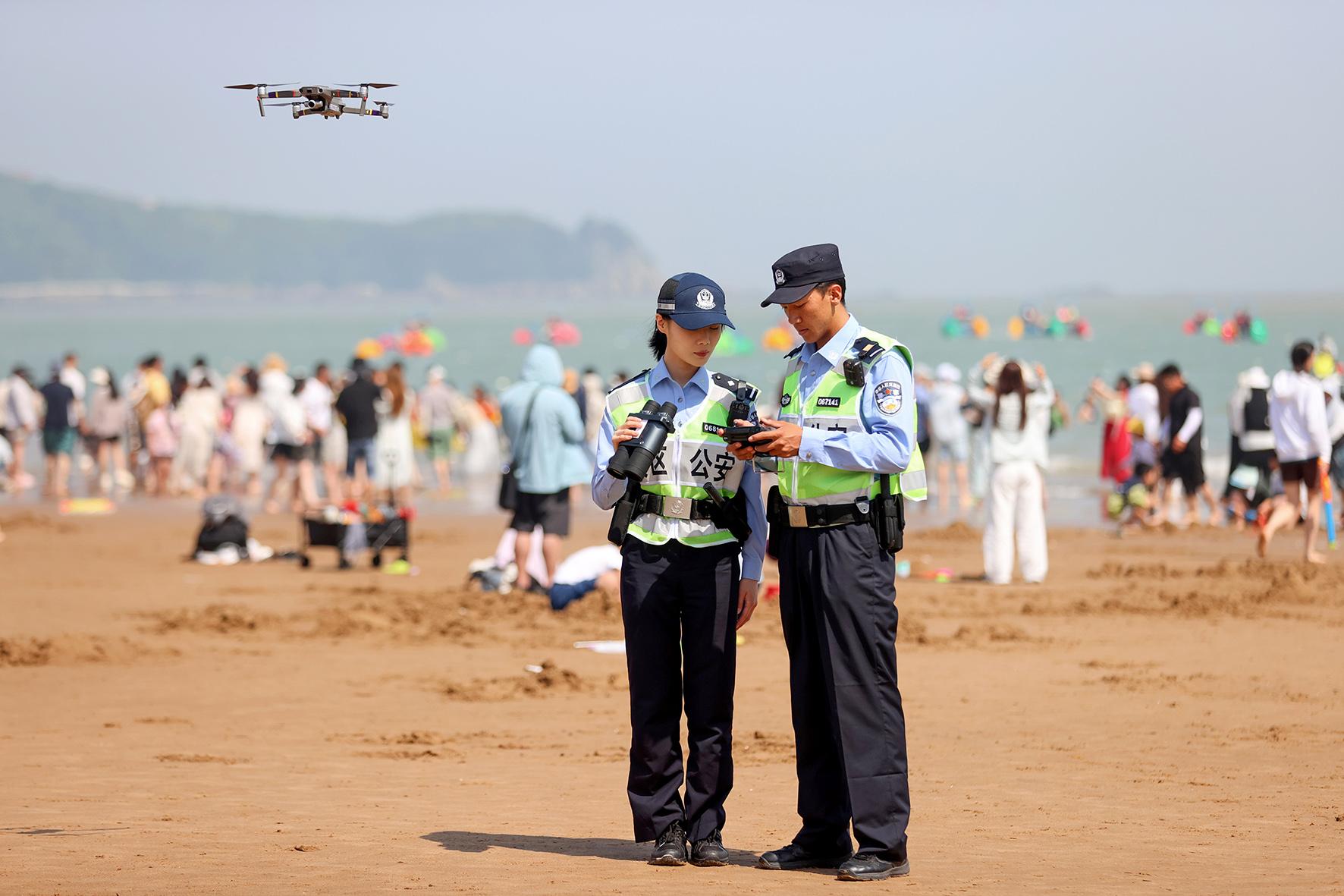 5月4日,浙江省舟山市公安局普陀山分局朱家尖派出所民警堅(jiān)守在轄區(qū)景區(qū)一線,開(kāi)展巡邏執(zhí)勤、無(wú)人機(jī)空中巡查等工作,守護(hù)游客平安。