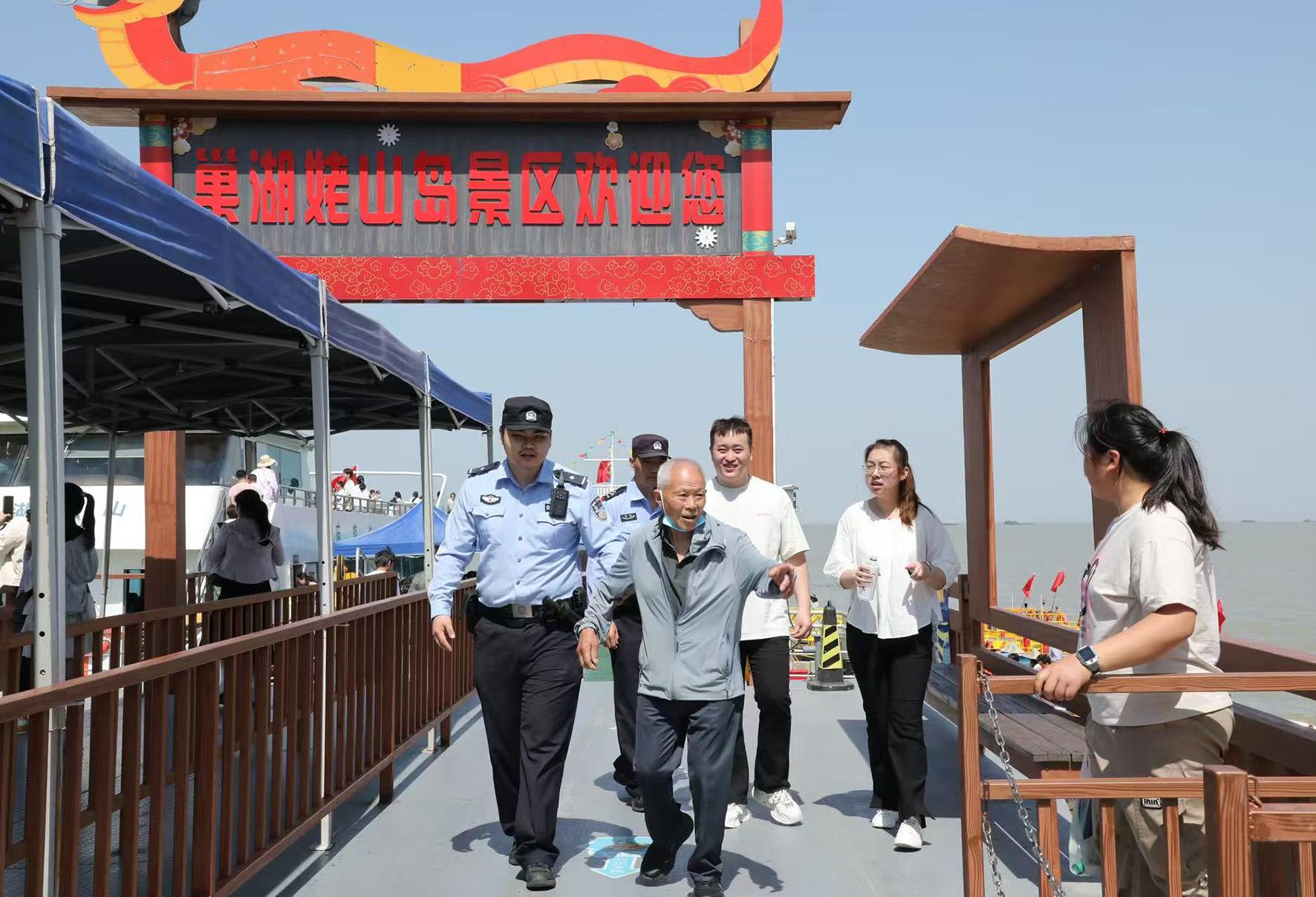 5月2日,安徽省巢湖市公安局民警攙扶老人從中廟渡口登船。