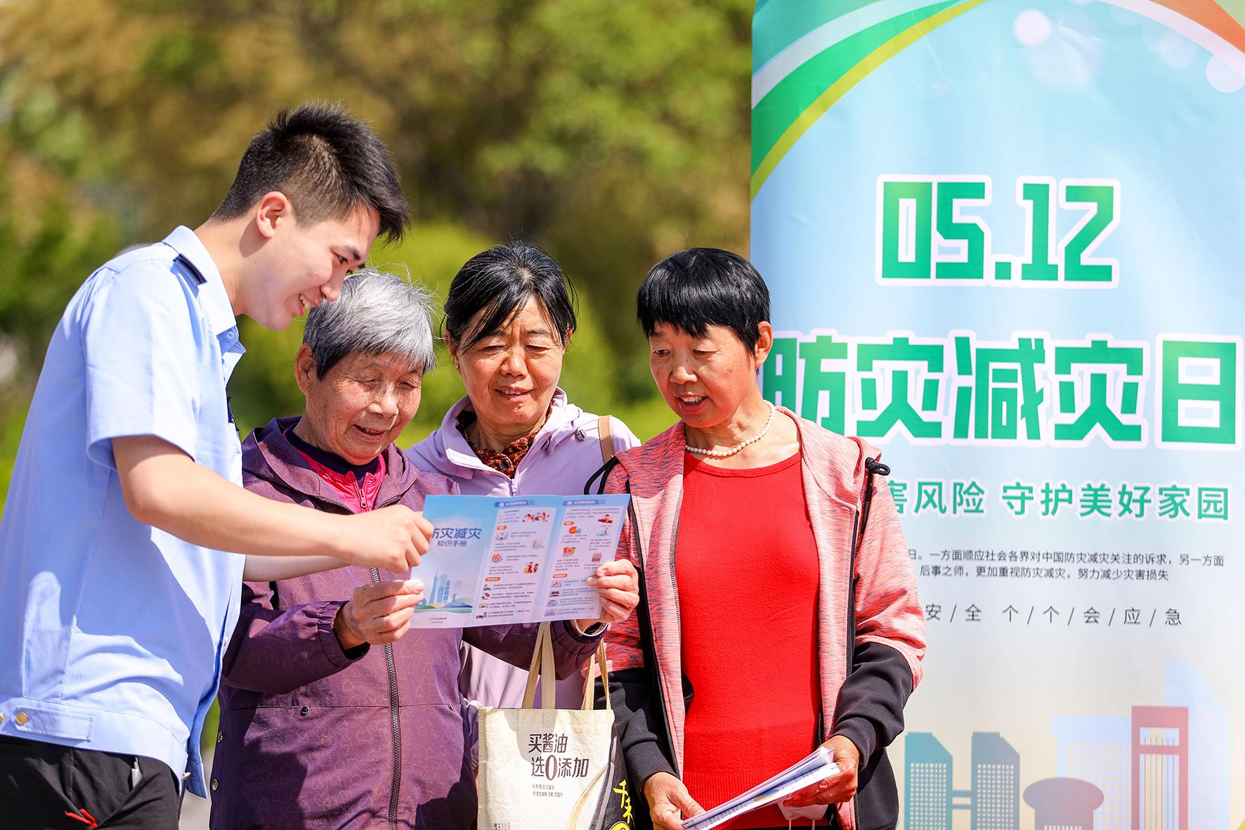 5月12日,在山東省青島市李滄區(qū)李滄文化公園舉辦的“全國防災(zāi)減災(zāi)日”集中宣傳活動中,應(yīng)急工作人員向市民介紹防災(zāi)減災(zāi)知識。