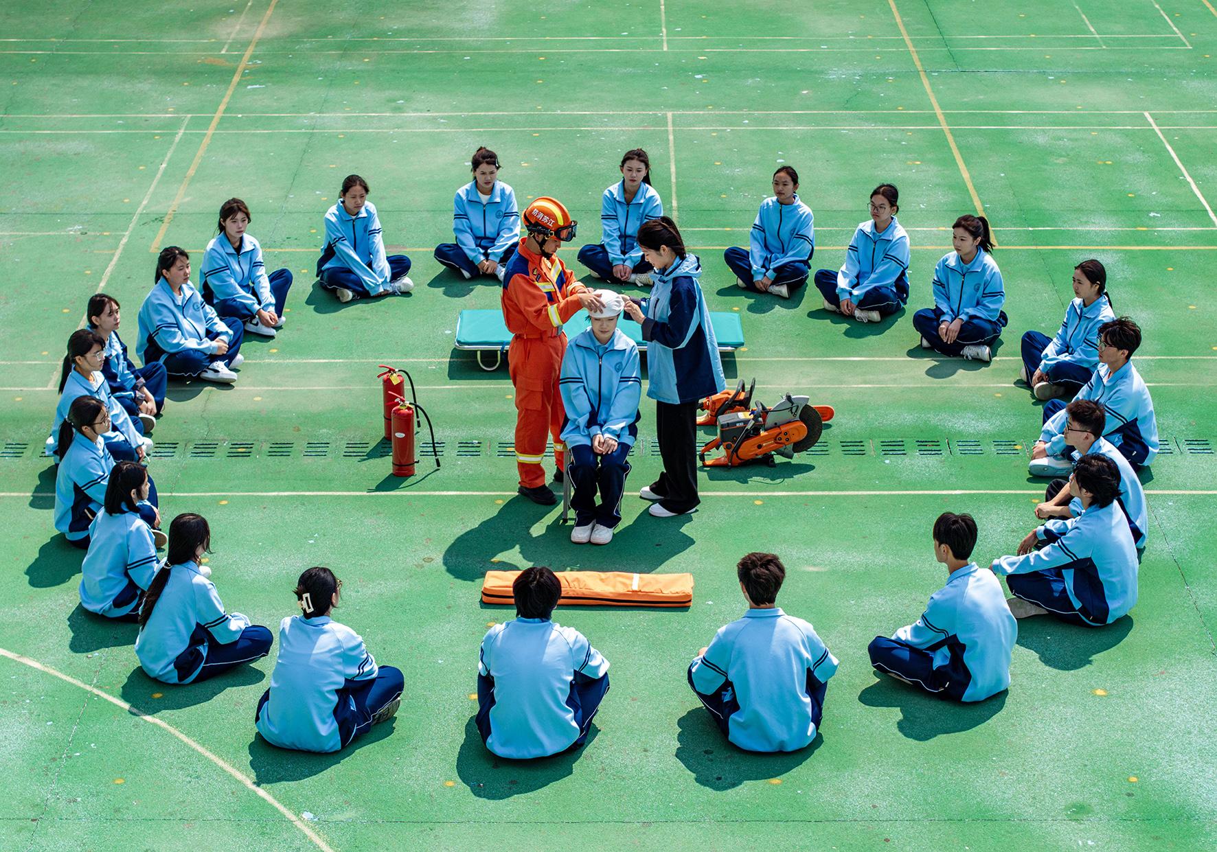 5月12日,江蘇省揚州市邗江區(qū)消防救援大隊消防員在揚州生活科技學(xué)校指導(dǎo)學(xué)生對傷員進行快速包扎。