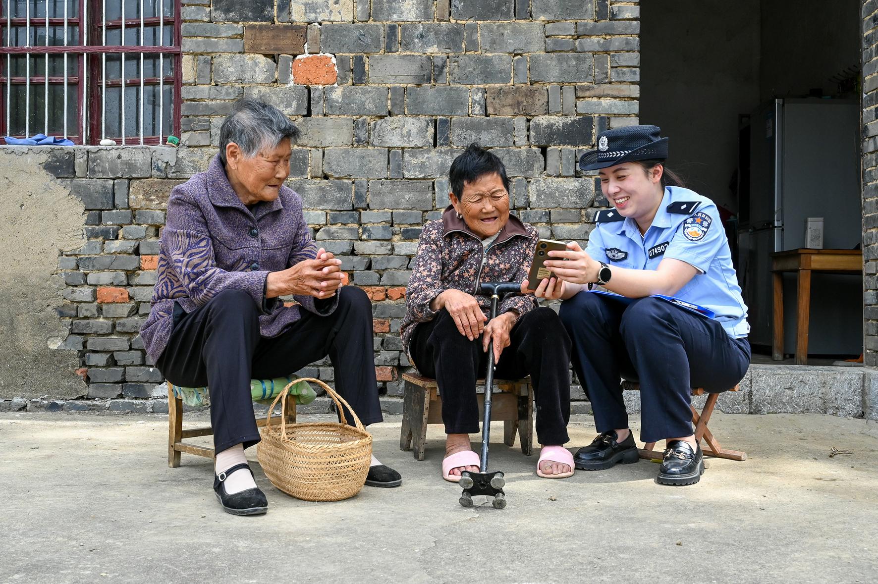 5月13日,在安徽省馬鞍山市和縣歷陽鎮(zhèn)興圩村,村警王雪純利用手機(jī)現(xiàn)場(chǎng)向老年人講解防范電信網(wǎng)絡(luò)詐騙知識(shí)。
