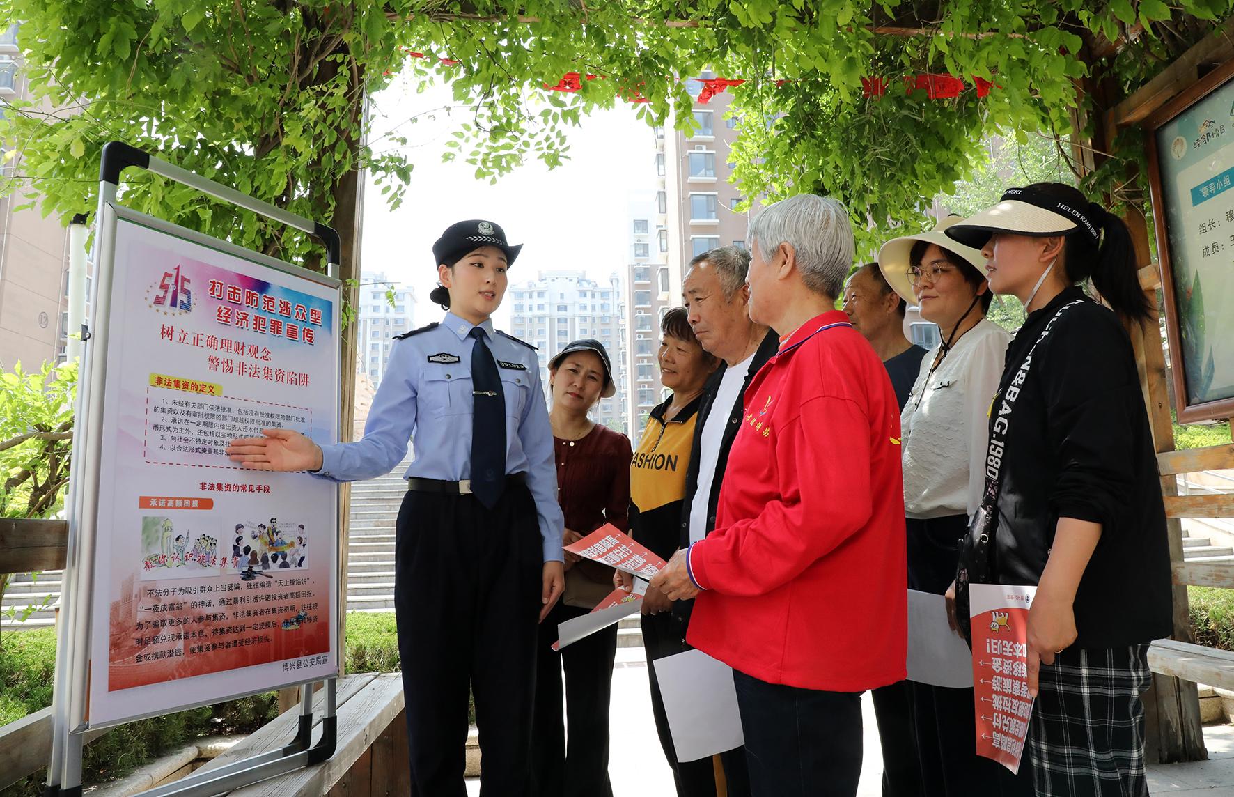 5月14日,山東省博興縣公安局經(jīng)濟(jì)犯罪偵查大隊(duì)民警在博昌街道錦繡社區(qū)向社區(qū)居民講解打擊和防范經(jīng)濟(jì)犯罪知識(shí)。