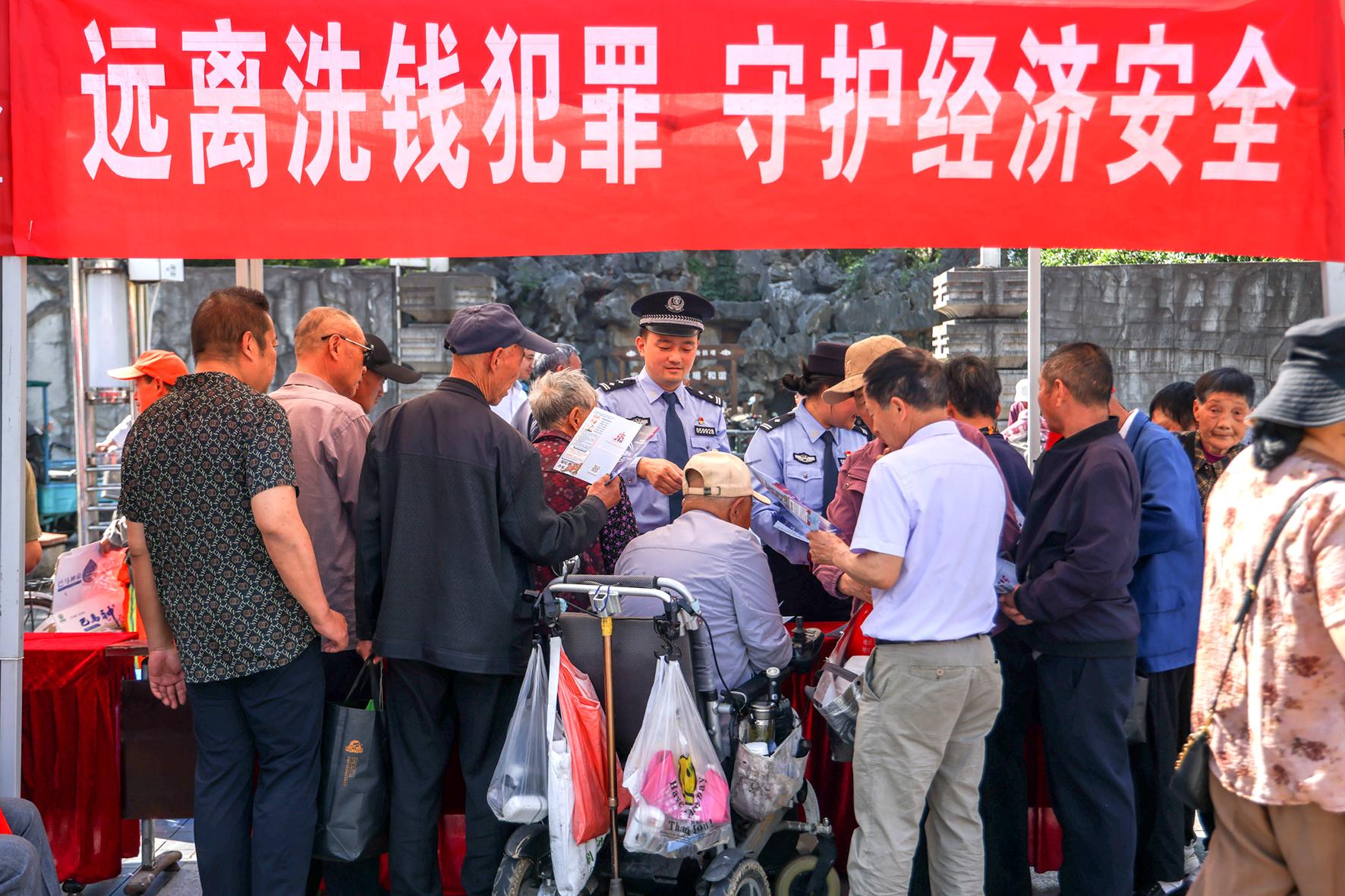 5月14日,安徽省 廣德市公安局經(jīng)偵民警在夫子廟廣場向群眾宣講防范非法集資、養(yǎng)老詐騙、高利轉(zhuǎn)貸等知識,守護(hù)群眾的“錢袋子”。