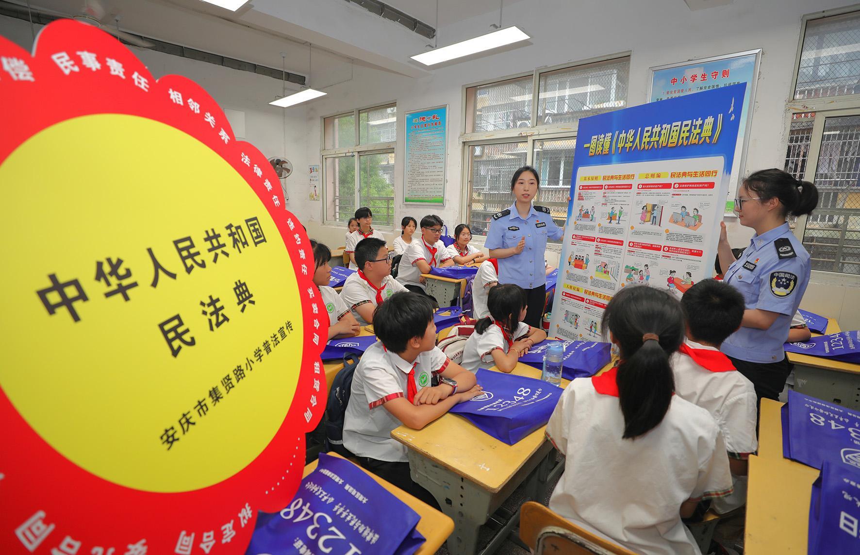 5月15日,安徽省安慶市大觀區(qū)司法局工作人員走進集賢路小學開展“‘民法’宣傳進課堂‘典’亮校園護成長”主題宣傳活動。