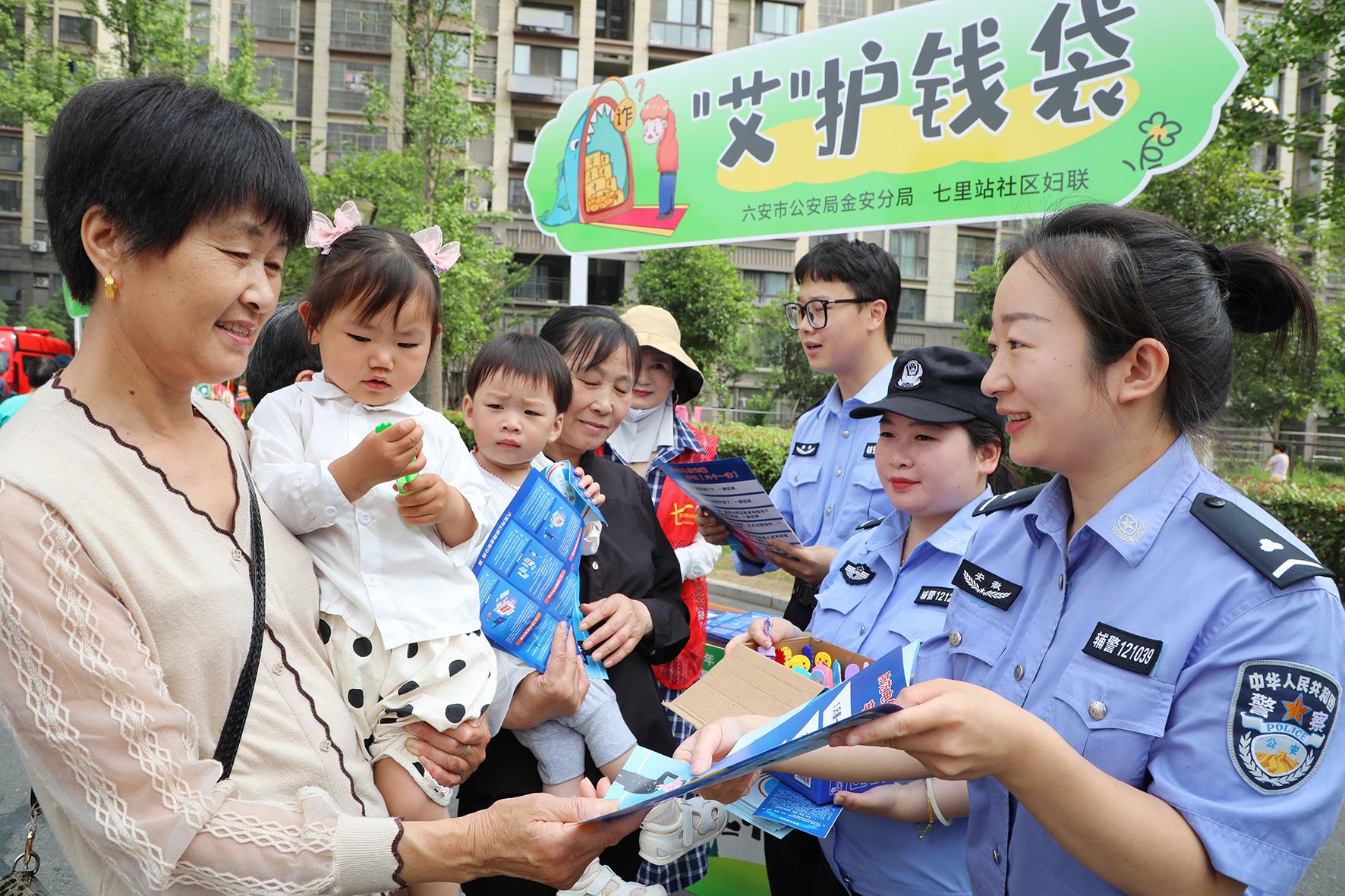 5月28日,安徽省六安市公安局金安分局民輔警在轄區(qū)東市街道七里站社區(qū)為居民普及防范電信網(wǎng)絡(luò)詐騙知識(shí)。