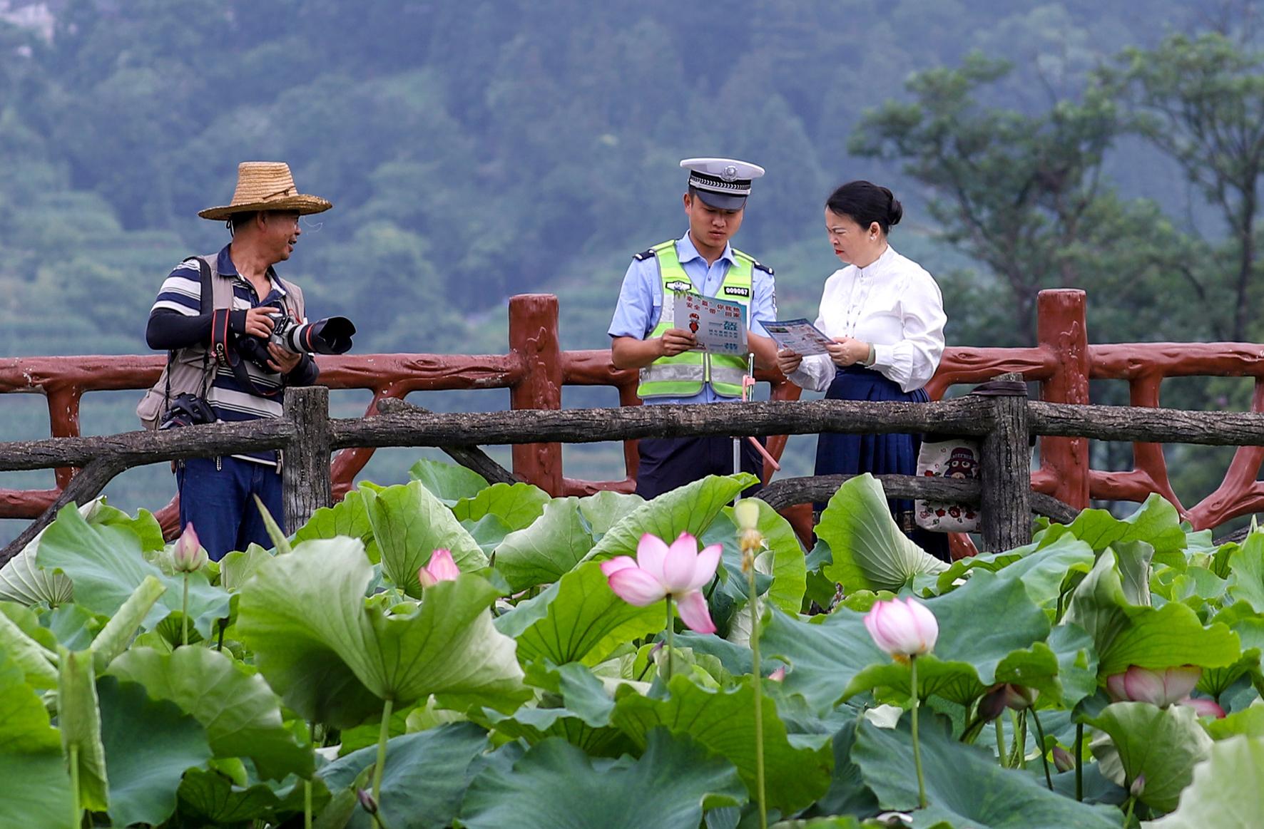 6月16日,貴州省丹寨縣交警大隊民警走進轄區(qū)卡拉景區(qū),向觀賞荷花的游客普及道路交通安全知識。