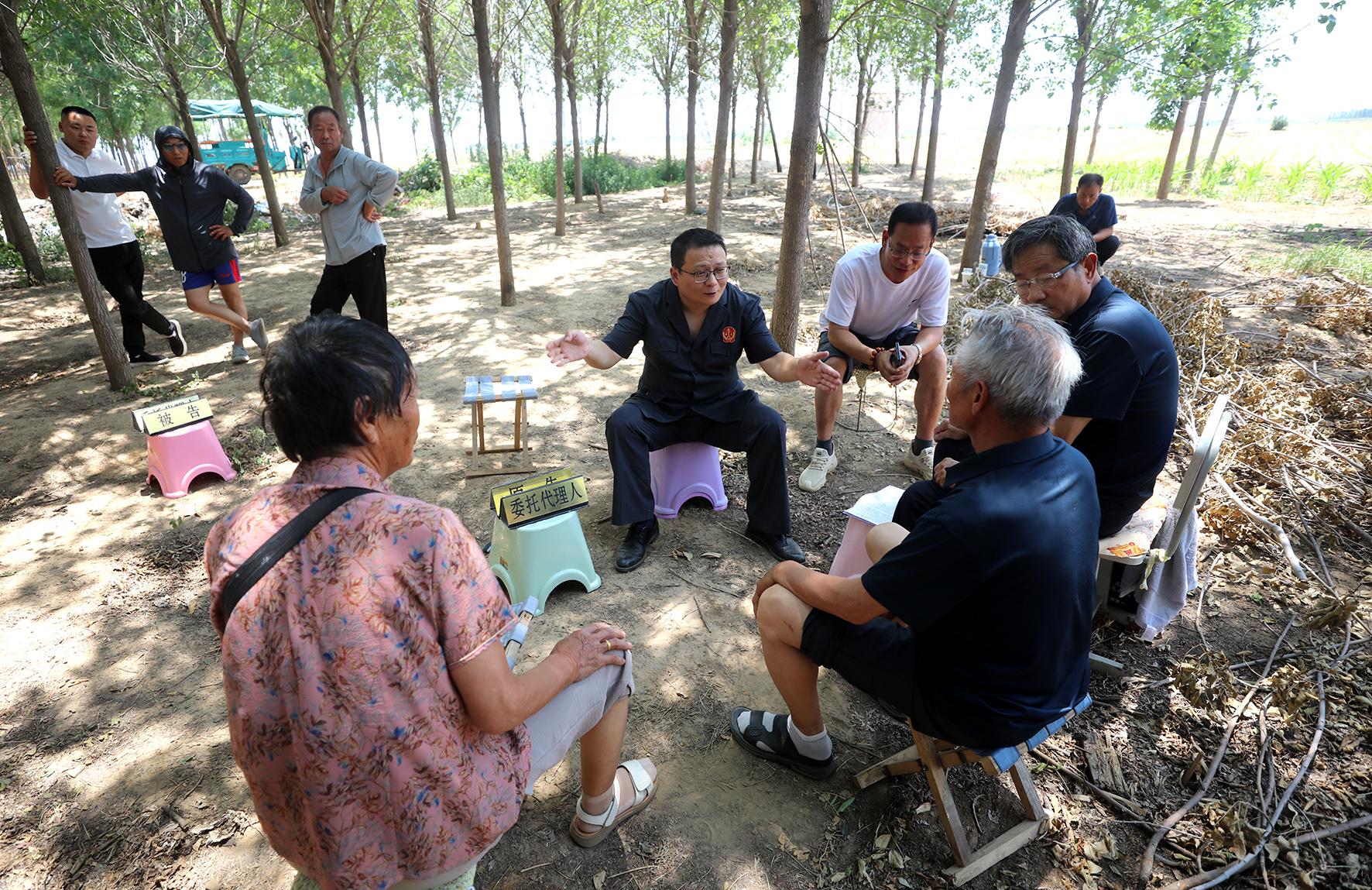 6月17日上午,河南省安陽(yáng)縣人民法院組織法官深入轄區(qū)高莊鎮(zhèn)田間地頭巡回審理一起土地承包經(jīng)營(yíng)權(quán)糾紛案。其間,法官對(duì)土地現(xiàn)狀進(jìn)行了實(shí)地勘驗(yàn),現(xiàn)場(chǎng)開庭審理,就地組織調(diào)解,以優(yōu)質(zhì)高效的司法服務(wù)把糾紛解決在群眾“家門口”。