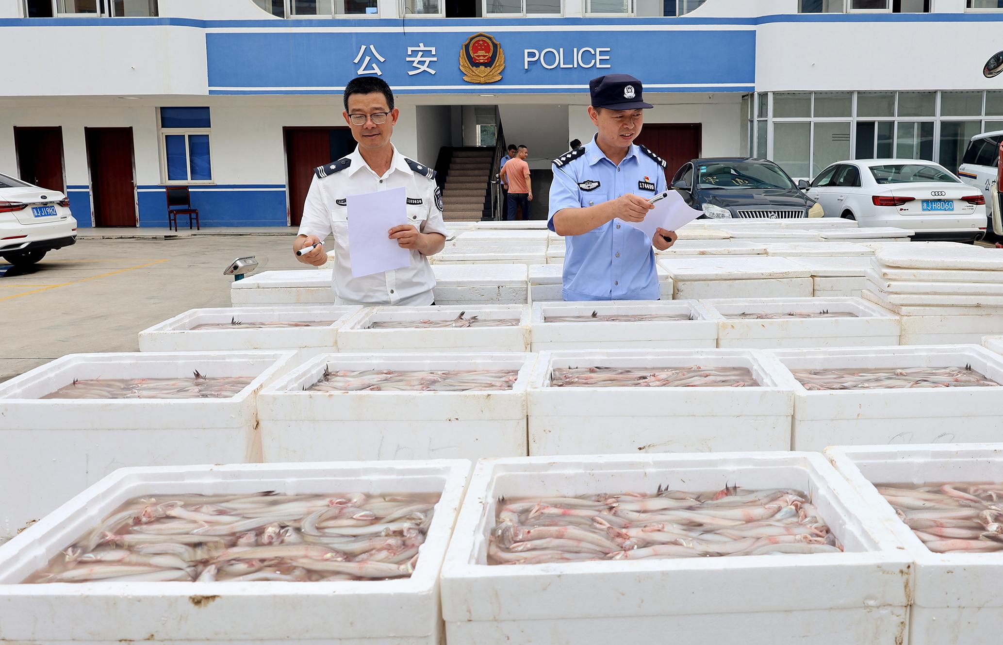 圖為海防大隊民警和漁業(yè)行政執(zhí)法人員在登記查扣的海產(chǎn)品。